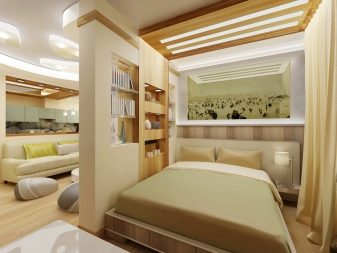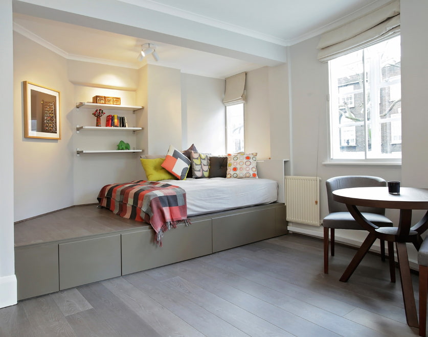 - Pódio no quarto ou na cozinha ajudará não apenas a separar visualmente as áreas conectadas, mas também fornecerá espaço de armazenamento adicional.