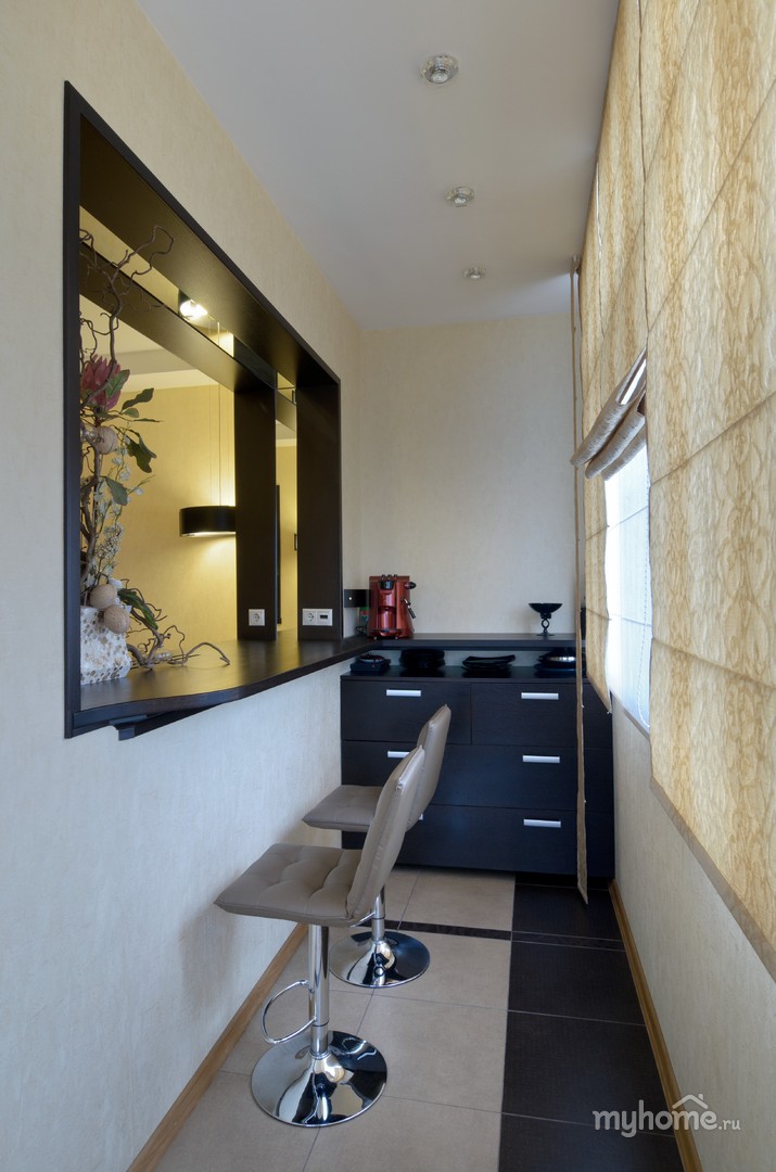 Vários projetos de cozinha e quarto em um cômodo envolvem o uso de uma loggia para aumentar o tamanho do cômodo. Por exemplo, uma loggia em estúdios em miniatura de 10 m² m pode ser usado como uma área de jantar com um bar, que também pode servir como um local de trabalho. O espaço principal em tal apartamento será ocupado por um quarto e uma cozinha.