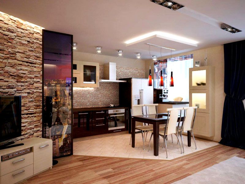 - Iluminação é aconselhável escolher para cada uma das zonas. A sala de estar pode ter vários modos de iluminação para atividades vigorosas e relaxamento. Na cozinha, você pode instalar LEDs acima da área de cozimento e da pia, e adicionar uma luz de teto acima da mesa de jantar.