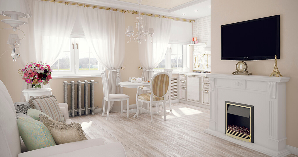 - Provença - a decoração das instalações no estilo do sul da França adicionará aconchego e aconchego ao apartamento. Flores, vasos, estatuetas, tecidos com motivos românticos, madeira, tons agradáveis são atributos importantes do estilo provençal. O principal é não exagerar nos elementos decorativos.