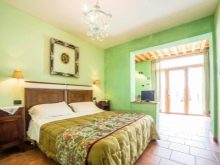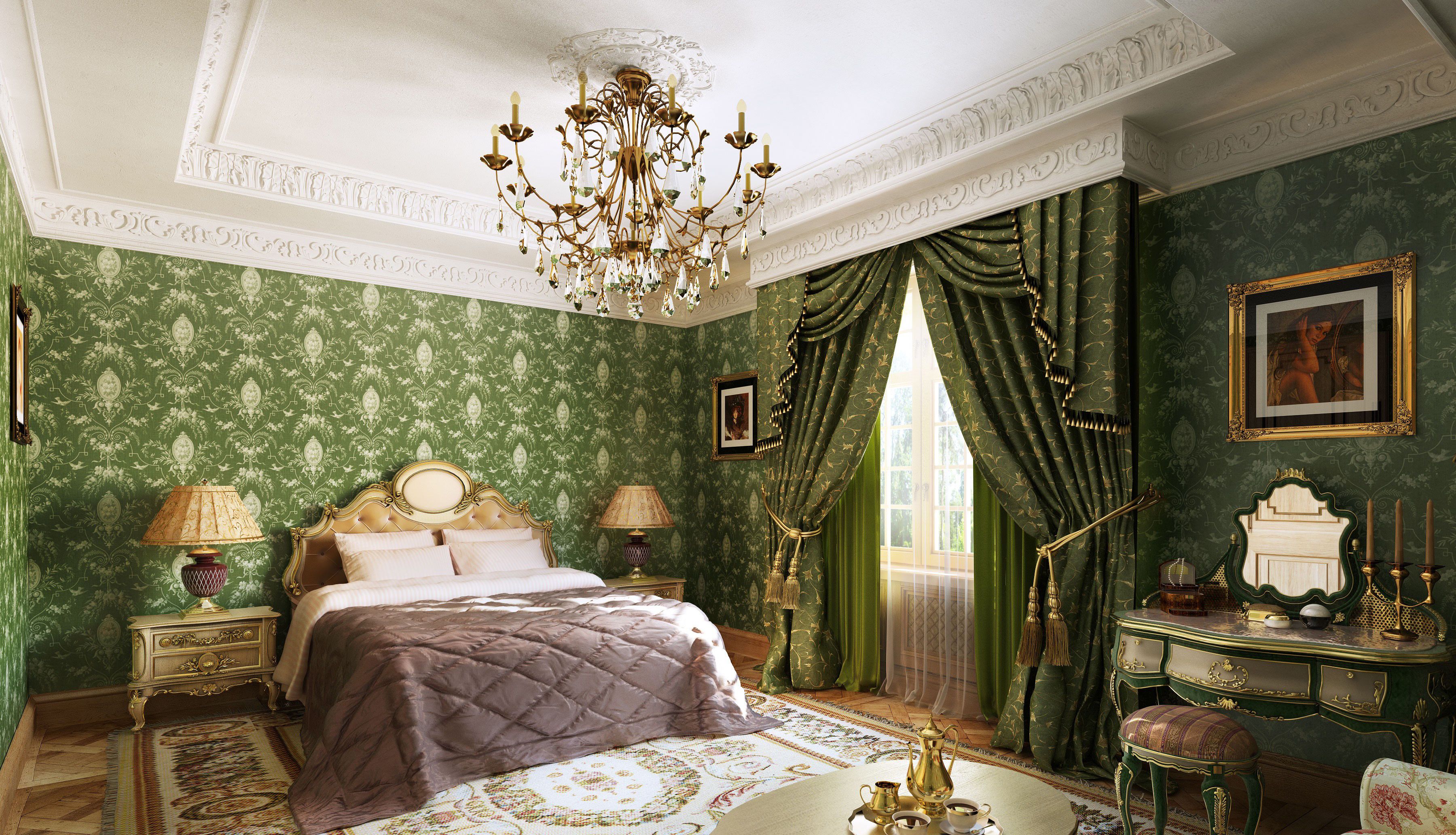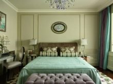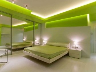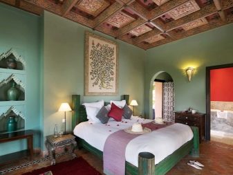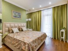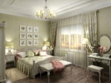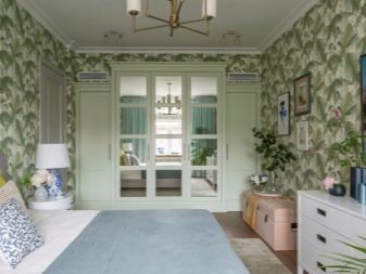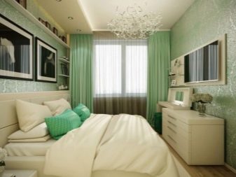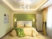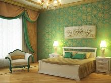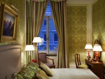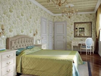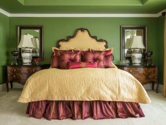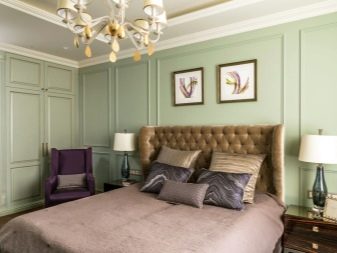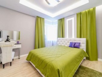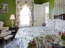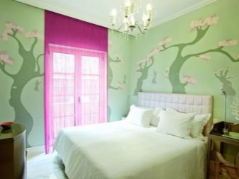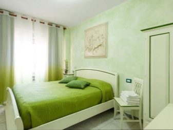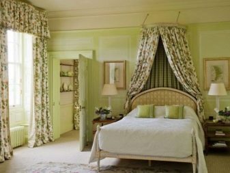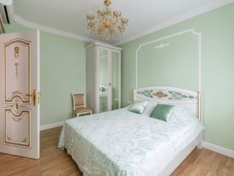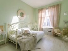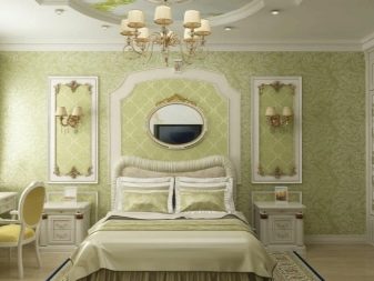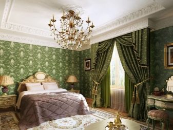 Apesar do fato de que deve haver muita luz, mesmo em uma sala grande, a iluminação de fundo não é necessária, geralmente um ou dois lustres luxuosos são colocados neles. Eles podem ser feitos de bronze ou madeira - materiais que ficam bem cercados por paredes e cortinas verdes. Os móveis também podem ser de madeira ou ferro, pintados em tons de branco ou pistache. Mas a roupa de cama e os travesseiros devem ser levados em tons verdes, a presença de estampas florais não será supérflua.