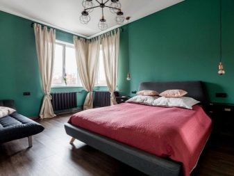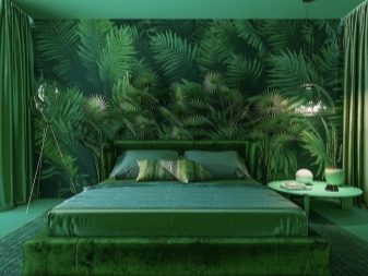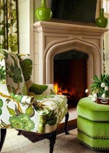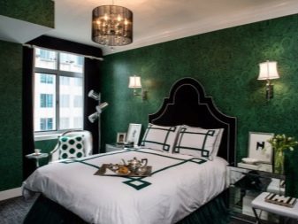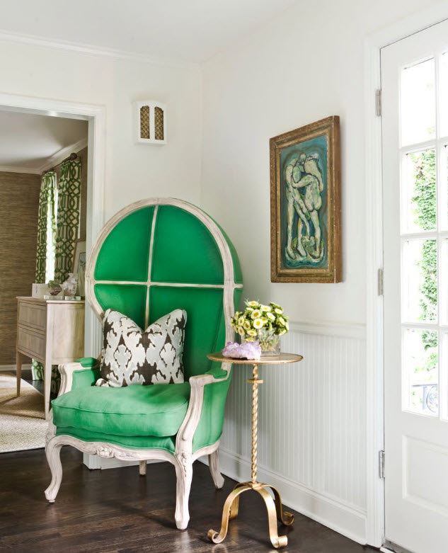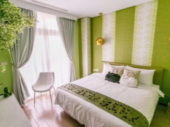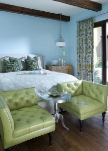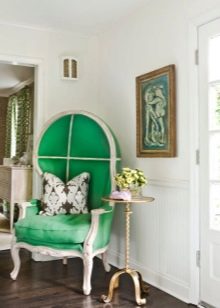 Poltronas verdes são outra peça de mobiliário que geralmente é comprada no quarto. Na maioria das vezes, ele atua como um sotaque brilhante, portanto, é escolhido em tons ricos. Vale a pena considerar que poltronas com sofá ou cama não devem ser da mesma cor - isso sobrecarrega muito o ambiente e afeta negativamente o ambiente nele.
