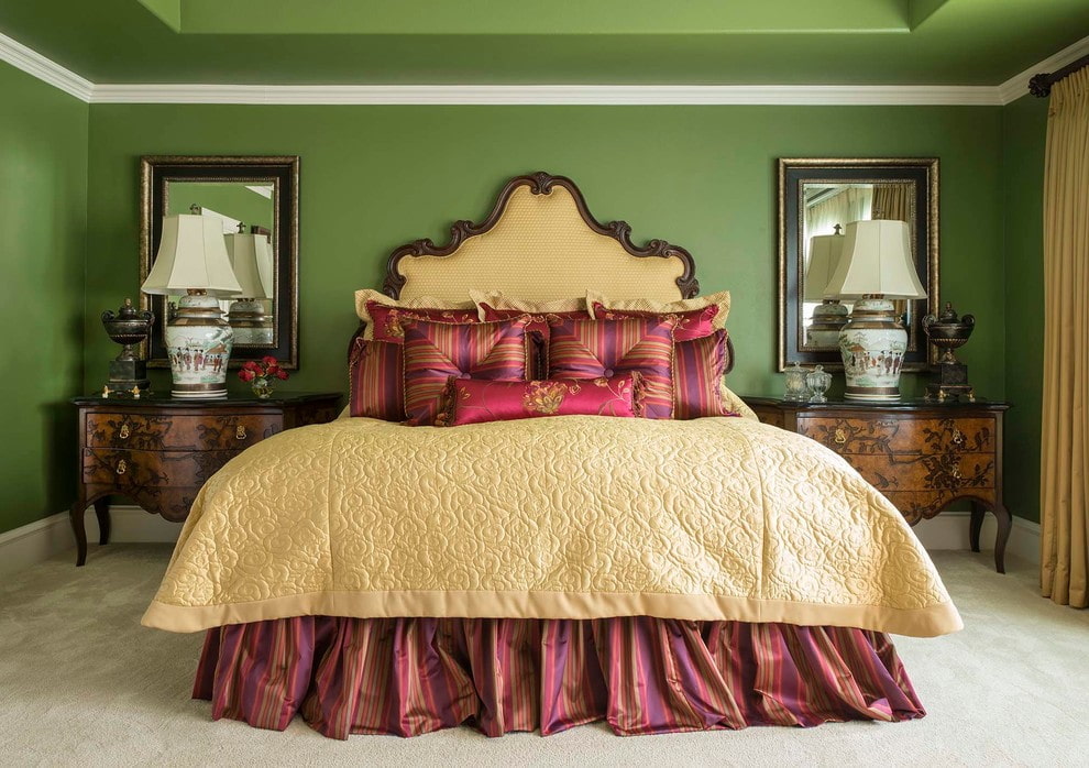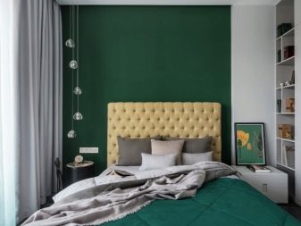 Verde com ouro é uma das combinações mais populares. Tons claros e delicados darão frescor ao ambiente, o ambiente lembrará o outono e o motivará para novas conquistas. Tons escuros e frios de verde conferem severidade ao quarto, o que é ótimo para pessoas sérias.
