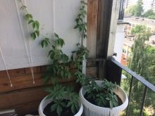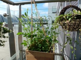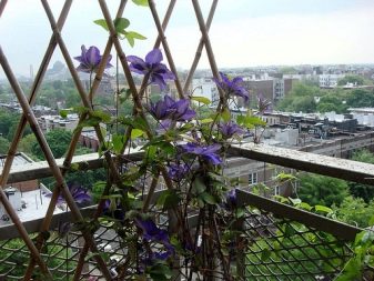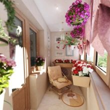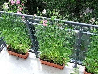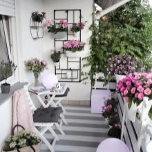 Canteiros de flores verticais podem ser facilmente organizados em uma pequena varanda. Os vasos de flores são fixados em cordas, instalados em escadas especiais ou em treliças de malha. Para decorar a varanda desta forma, você pode usar uvas juvenis, loach, moonflower, capim-limão ou ervilhas.