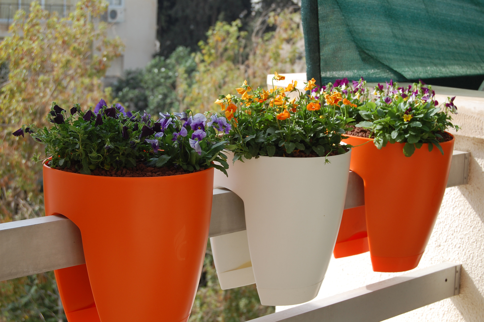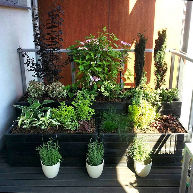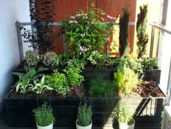Vários tipos diferentes de recipientes de plantas podem ser colocados na varanda ao mesmo tempo. O principal é pensar com antecedência como ficará o resultado.