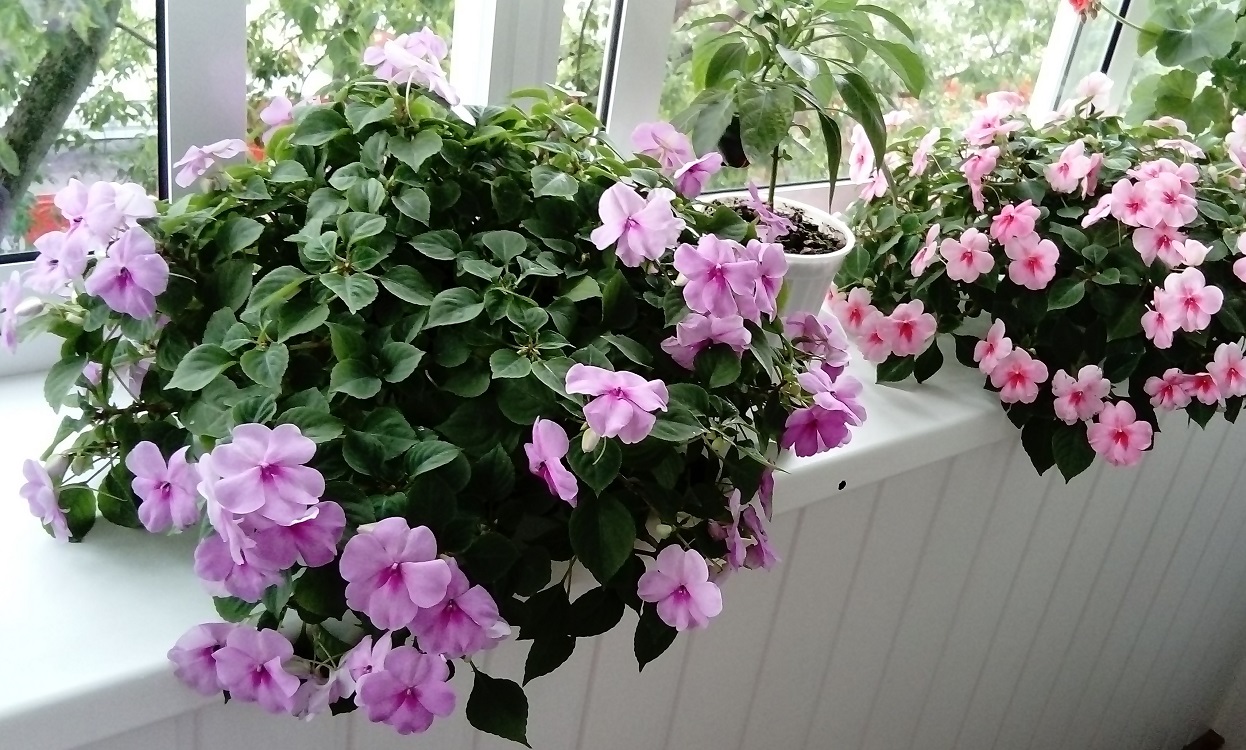 Bálsamo. Os arbustos de 20 a 30 centímetros de altura são decorados com grandes flores de cor branca, rosa ou vermelha. Essas plantas crescem melhor em sombra parcial.Para que se desenvolvam normalmente, eles precisam ser regados abundantemente a cada poucos dias. Sem isso, eles desaparecem rapidamente.