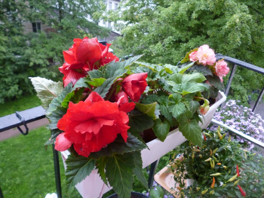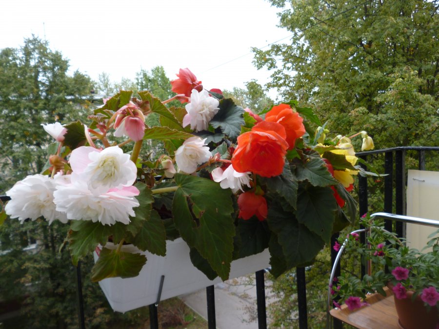 Begônia. Esta planta perene se sente muito bem na varanda. Em altura, cresce até 60 centímetros. Em alguns casos, suportes especiais são necessários para o desenvolvimento normal das begônias. Regue a planta 1-2 vezes por semana. No processo, você precisa garantir que a terra não fique muito úmida, mas também não seque. Para preservar a planta até o próximo ano, as folhas e caules são cortados e os tubérculos retirados do solo e bem secos. Guarde-os em uma sala seca e escura.