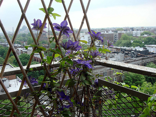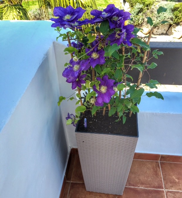 - Clematis. Esta planta perene está crescendo rapidamente. Os ramos crespos são decorados com flores grandes e brilhantes. É melhor cultivado em suportes especiais. Clematis é regado a cada 4-5 dias. Se a terra seca frequentemente, a planta morre muito rapidamente. Ao mesmo tempo, um forte alagamento do solo também não deve ser permitido.
