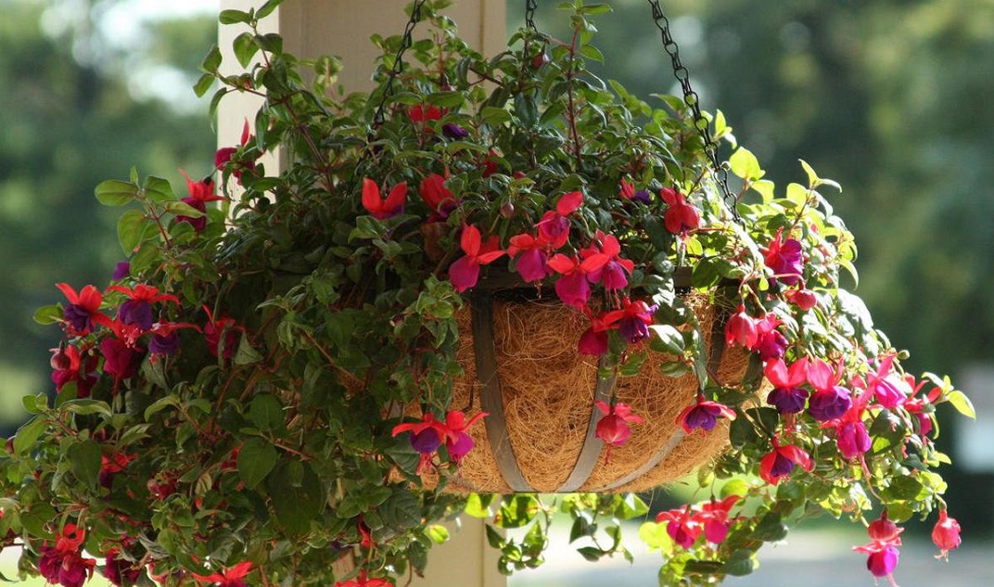 - Fúcsia. Um lindo ampelous perenes floresce da primavera ao final do outono. É melhor cultivado em vasos suspensos. As fúcsia são regadas a cada poucos dias.