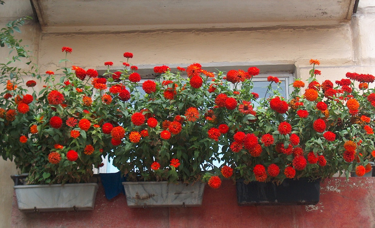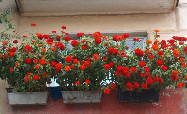 Zinnia. É uma planta bastante tolerante ao calor, também conhecida como a principal. Ela adora luz e calor. Portanto, é ótimo em uma varanda ensolarada. Zinnia floresce até a primeira geada. Necessita apenas de rega regular.