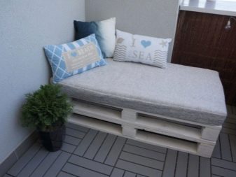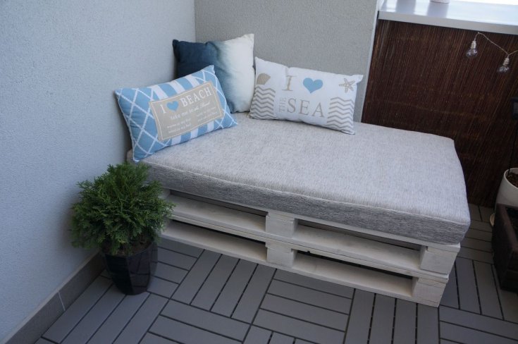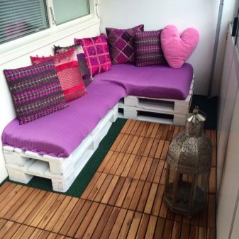 A solução mais simples seria um sofá de varanda com paletes. Para fazer isso, você só precisa prender alguns paletes com cantos de metal e processá-los - lixar e pintar. Depois disso, só falta colocar um travesseiro ou um colchão em cima. Ao escolher paletes, você deve se concentrar nos seguintes critérios:
