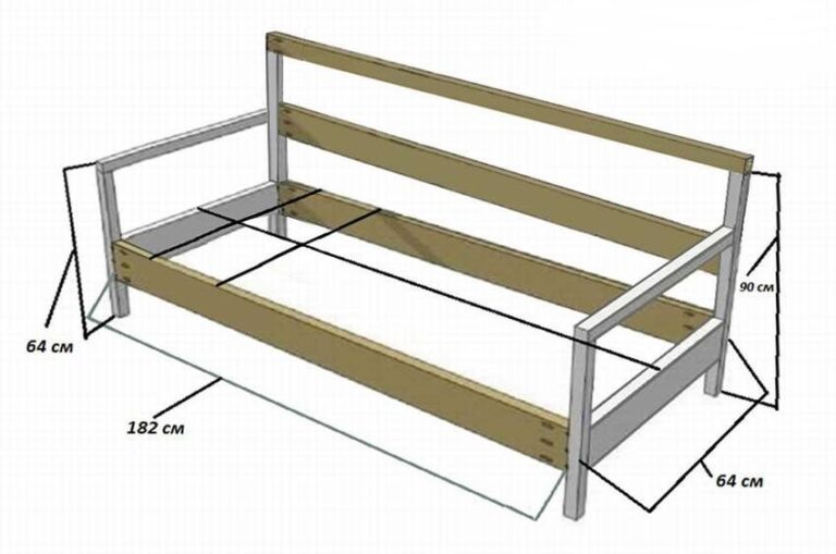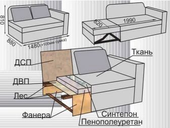 De forma simplificada, o modelo do sofá deve se parecer com um paralelepípedo. De acordo com o desenho desenhado, as vigas são conectadas, as quais são posteriormente revestidas com placas de contraplacado, o que permitirá que a estrutura suporte cargas de peso impressionantes. Parafusos e cantos de aço são usados como fixadores, peças individuais precisam ser coladas adicionalmente. O estofamento é feito de várias maneiras.