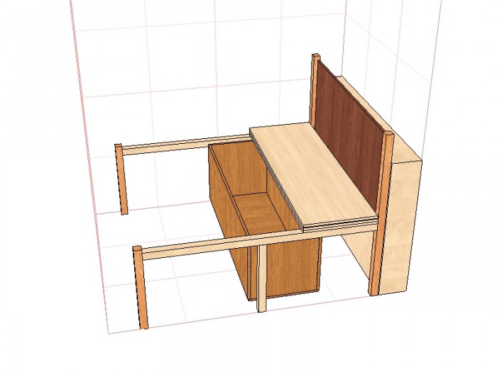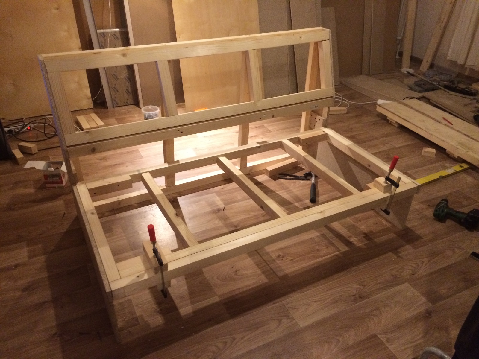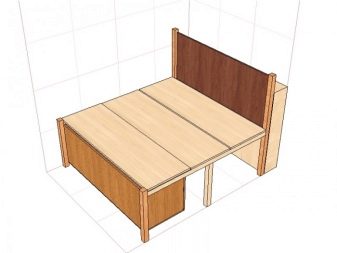 Depois de traçar um diagrama e aplicar as marcações principais, você pode prosseguir para o corte das peças estruturais. A moldura é recortada em madeira densa, reforçando os elementos principais com parafusos e cantos auto-roscantes. No futuro, os módulos extraíveis servirão de gaveta para coisas velhas, bem como de base para um colchão e almofadas de tecido. São feitos de aglomerado em forma de caixa completa e complementados por uma tampa robusta.