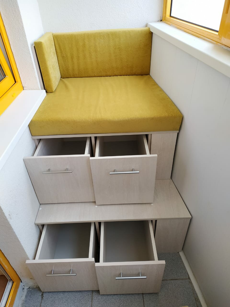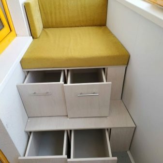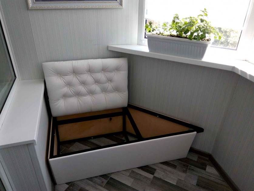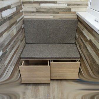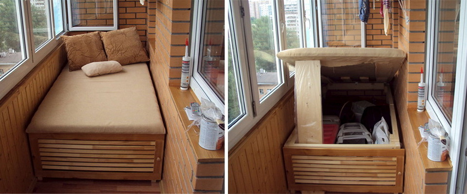 - Um local conveniente para guardar coisas raramente usadas na loggia é um modelo com gavetas. Esta é uma solução ergonômica. Por um lado, você cria um local de descanso confortável, por outro, você usa móveis para guardar roupas sazonais, conservação e utensílios de jardim. Tal sofá ajudará a liberar o espaço principal da sala de estar e tornar a varanda mais funcional.