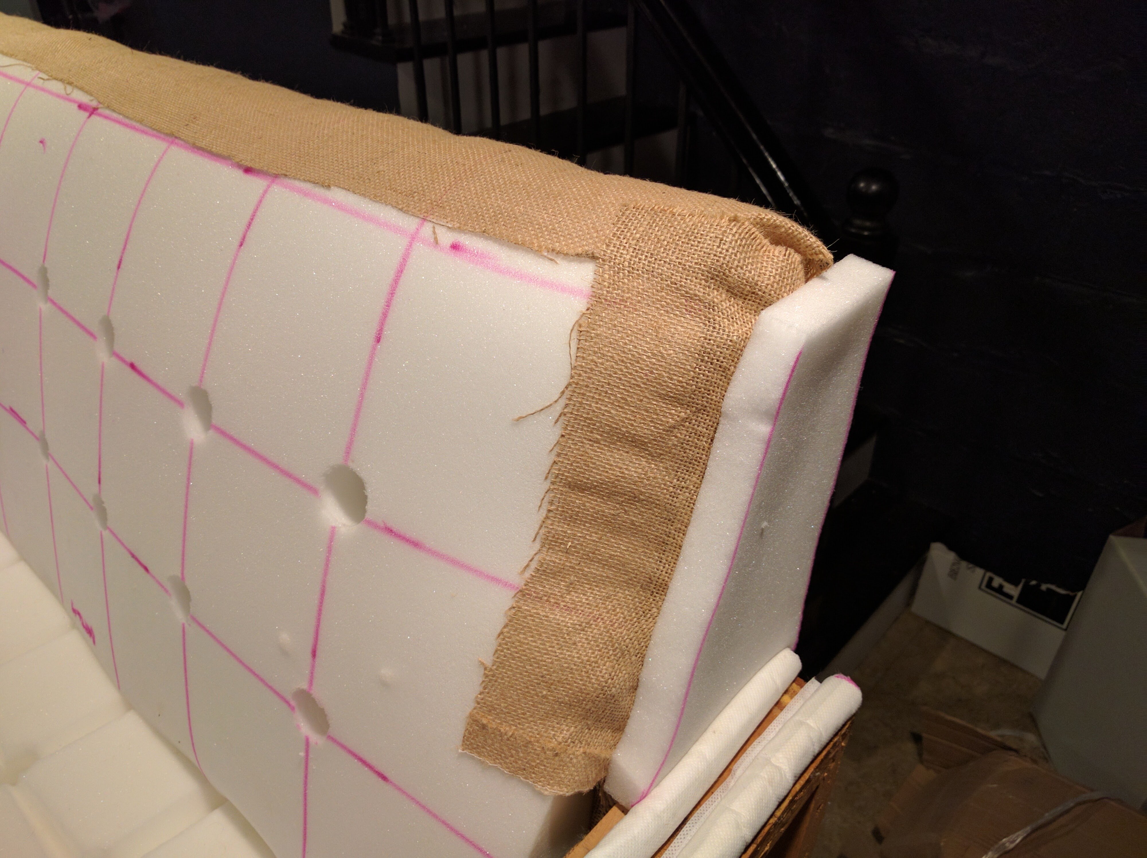 Após a formação da moldura do sofá, bem como de todos os módulos extensíveis, pode-se começar a costurar a parte mole. Para isso, todos os elementos principais devem ser revestidos com forro antes mesmo de serem fixados ao quadro. Para deixar os assentos macios, uma peça de tamanho adequado é cortada da espuma de borracha, uma fina camada de poliéster é colocada sobre ela e fixada com cola na parte dura do assento. Em seguida, com um grampeador de construção, é fixado ao material principal.