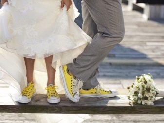 As opções listadas são consideradas tradicionais para a moda nupcial, mas cada vez mais casais estão se afastando dos pedidos habituais, organizando sua própria festa. Por exemplo, alguns recém-casados chegam ao registro de jeans: neste caso, o noivo pode não usar sapatos, mas tênis, e vai ficar bem. E se você está planejando um casamento no estilo retrô, então deve escolher os sapatos que são relevantes para aquela época.