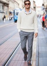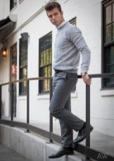 - Calças cinza, bege e qualquer outra escura podem ser combinadas com sucesso com camisas ou blazers disponíveis no guarda-roupa. Se você precisa criar uma imagem para sair com os amigos, a calça pode ser usada sob uma camiseta ou um suéter da moda.