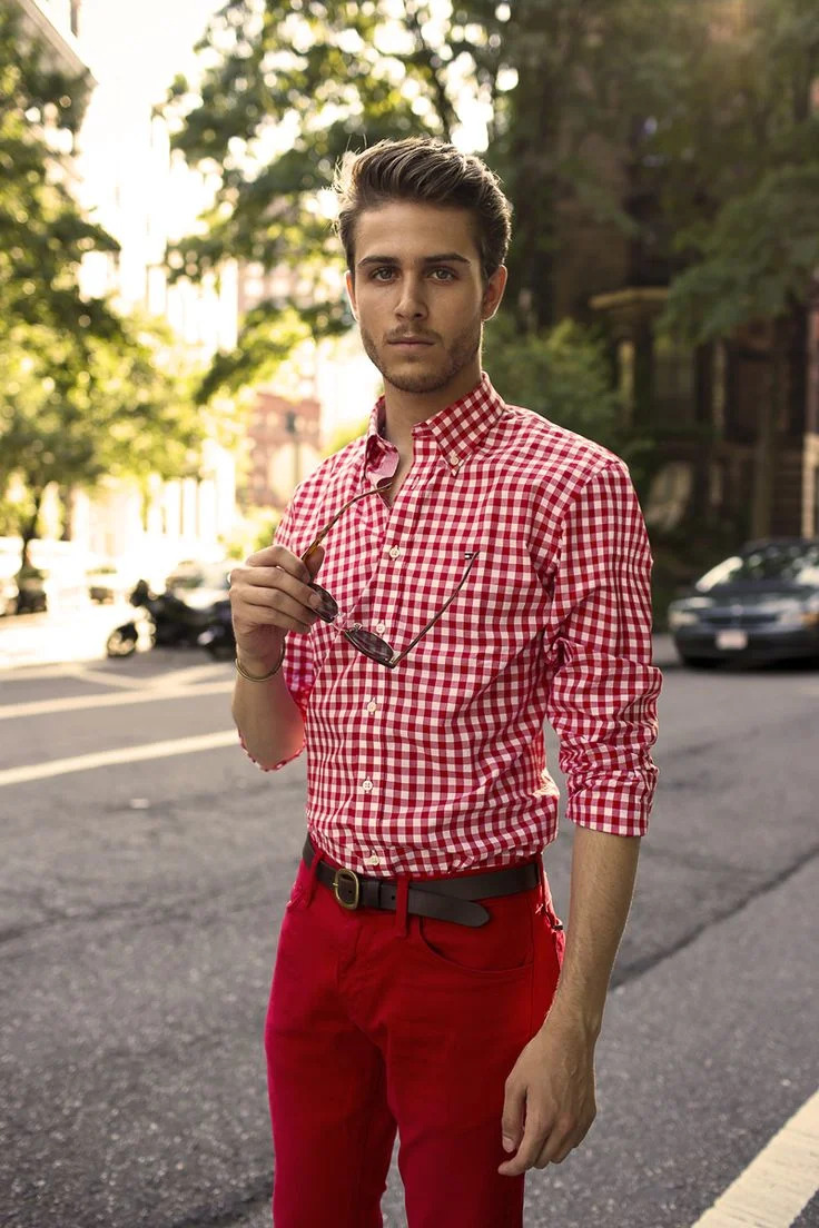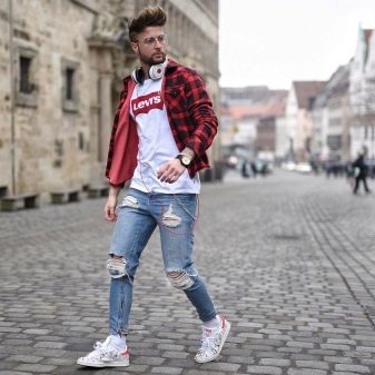 Camisas xadrez ou listradas especialmente os homens usam por baixo de jeans ou de calças, e vale a pena dizer que tais laços ficam muito bem. Debaixo uma camisa xadrez laranja ou vermelha vale a pena escolher jeans de cores claras, por exemplo, azul.