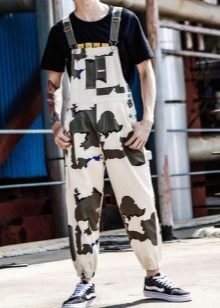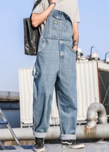 - Macacões largos são uma salvação para os homens com uma figura enorme que têm que escolher roupas largas. Calças retas e largas, alças de ombro - isso é exatamente o que é ideal para homens de constituição forte e alta. As calças costumam ter bolsos de remendo, fivelas, zíperes e presilhas para o cinto. Esses modelos são uma combinação de calças cargo denim e suspensórios.