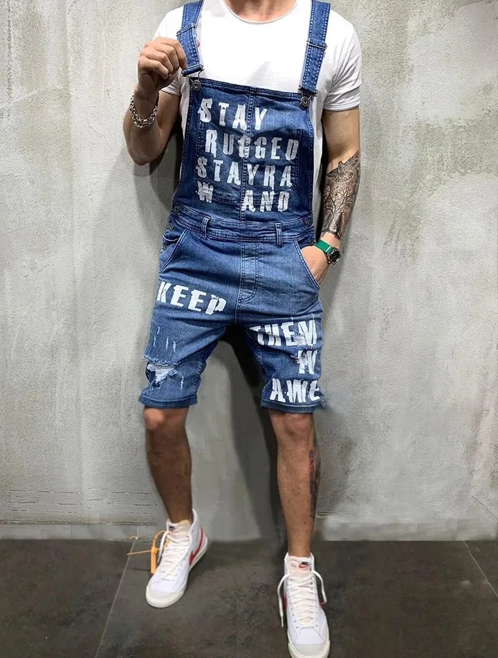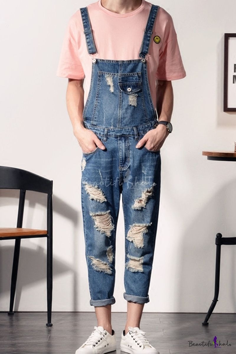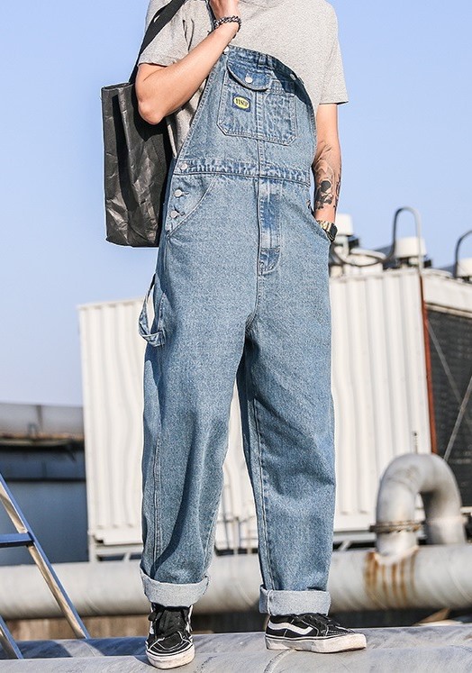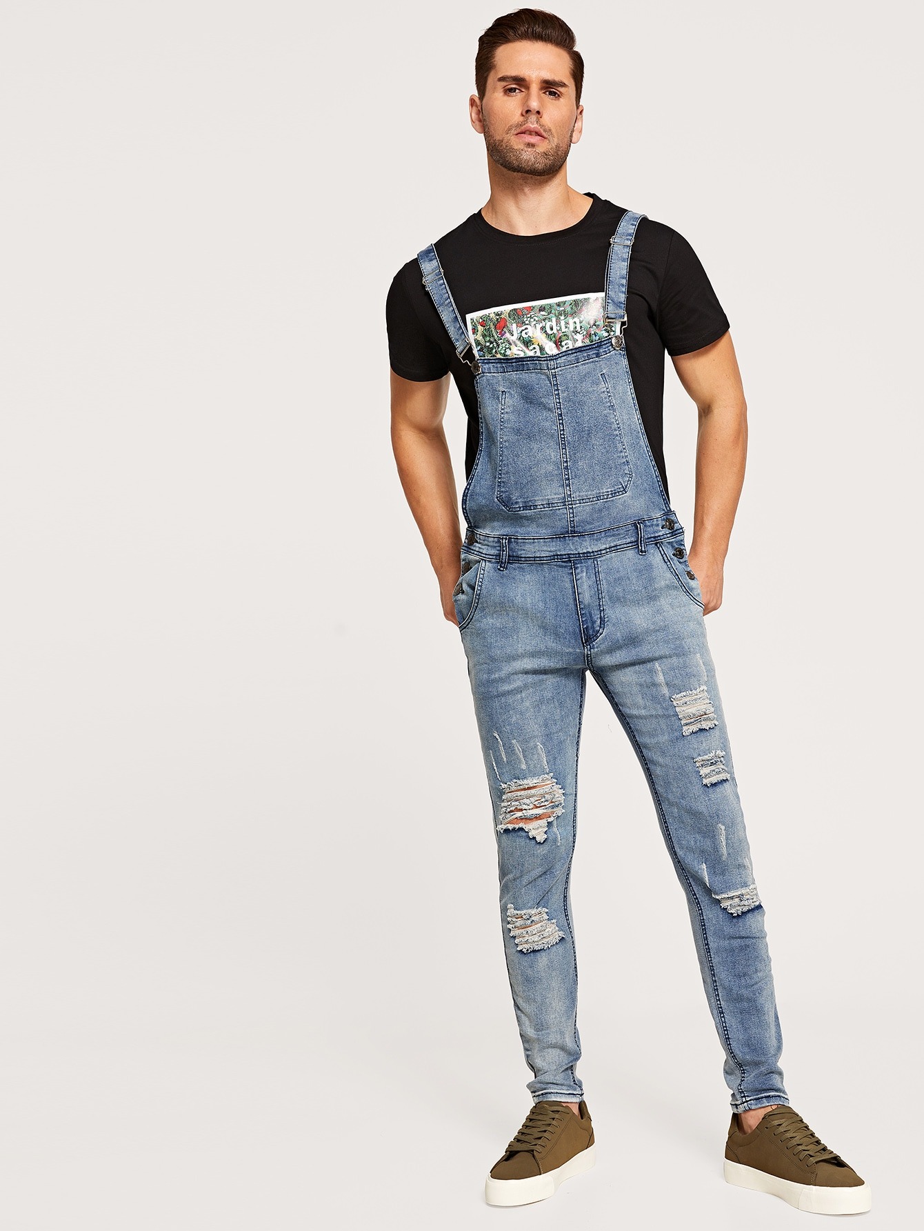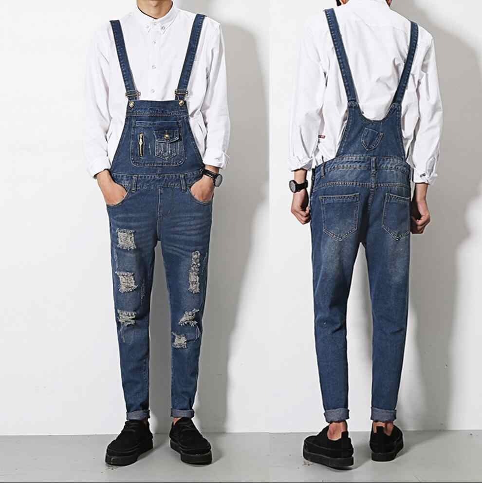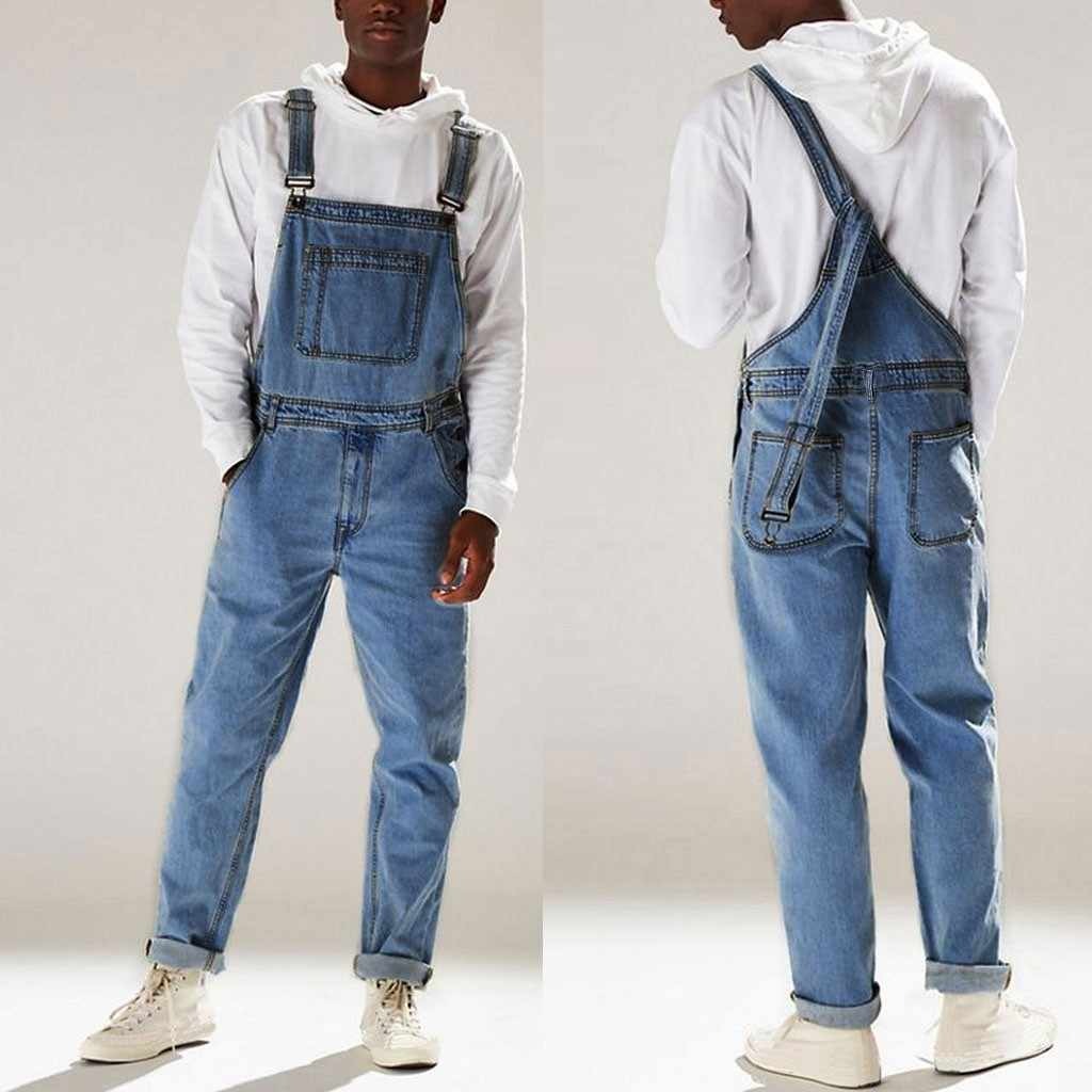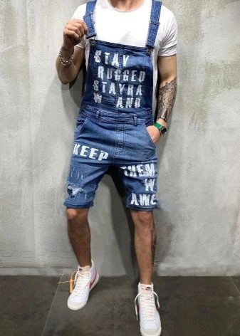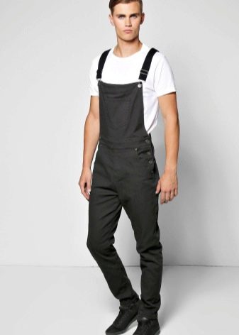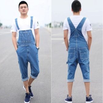 Macacão jeans com suspensórios finos em primeiro lugar, vale a pena considerar homens com um físico atlético e um relevo pronunciado do torso. As alças chamam a atenção para os ombros, por isso a parte superior do corpo deve ser perfeita.