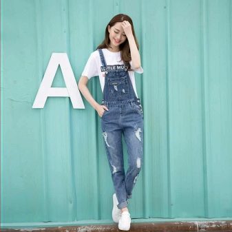 Macacões com mangas para uso diário raramente são comprados, embora essa tendência já comece a surgir. Só que existe um modelo de denim fino com calça enrolada, capuz e joelhos esfiapados.