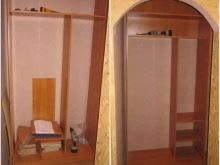 - Instalação em nicho. Se houver tal saliência na parede do corredor, é recomendado usá-la com o benefício de colocar um armário deslizante. Você precisará colocar guias para as portas, comprar as próprias portas e acessórios para móveis. Na hora de escolher este projeto, o custo de aquisição de materiais será mínimo, já que a estrutura embutida sairá do chão.