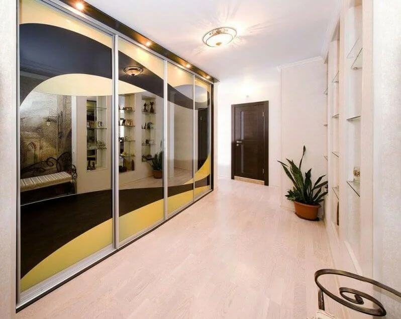 - Ao selecionar o material para a confecção de portas quando localizadas no corredor, recomenda-se a inserção de um espelho, pois permite ampliar visualmente o espaço e aumentar a funcionalidade do gabinete. As portas com jato de areia não são uma opção menos bem-sucedida. A opção mais econômica é o material de aglomerado. Se você quiser adicionar personalidade ao projeto, pode decorar as portas com imagens fotográficas impressas.