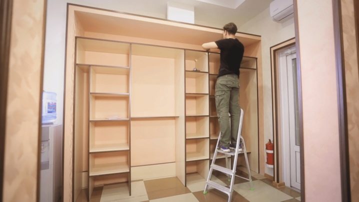 Você pode fazer um guarda-roupa sob encomenda desenhando você mesmo os desenhos, levando em consideração a filmagem e a altura dos tetos de suas próprias instalações, mas o preço de tal produto será pelo menos 2 vezes exagerado. Para não gastar dinheiro na compra de um armário pronto, você pode montar uma estrutura feita em casa. É recomendável fazer um gabinete se você tiver habilidades mínimas de construção e a capacidade de usar todas as ferramentas.