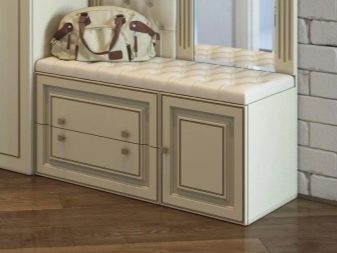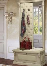 - Com um banco. Outro tipo de móvel conveniente que facilitará muito o processo de calçar os sapatos. A sapateira está na parte inferior, e na parte superior há um pequeno pufe, no qual você pode se sentar. Neste caso, o espelho é fixado sobre a bancada.