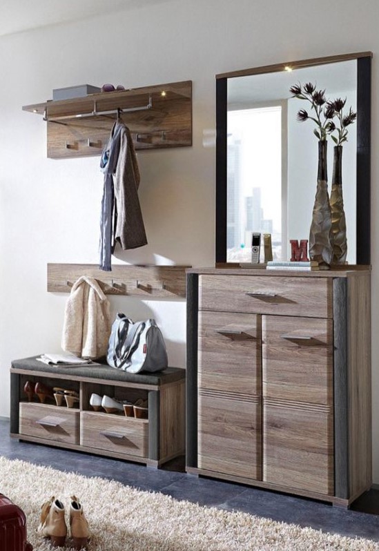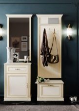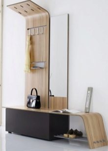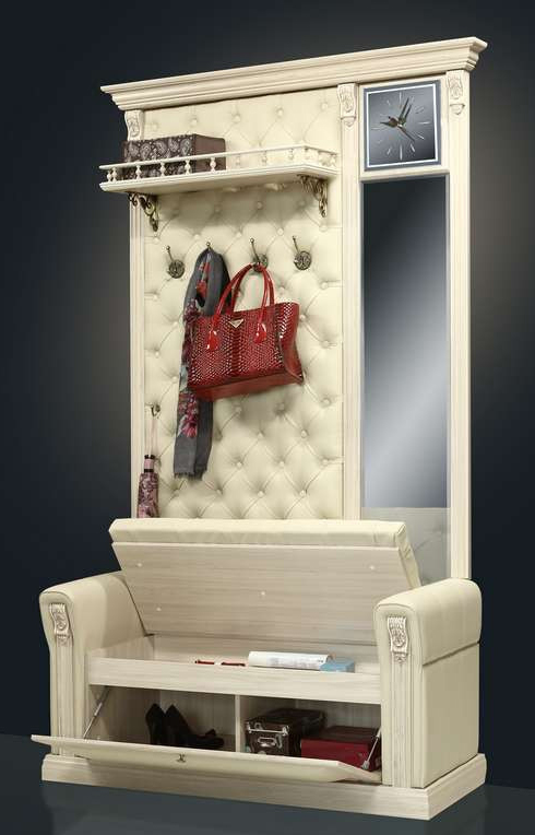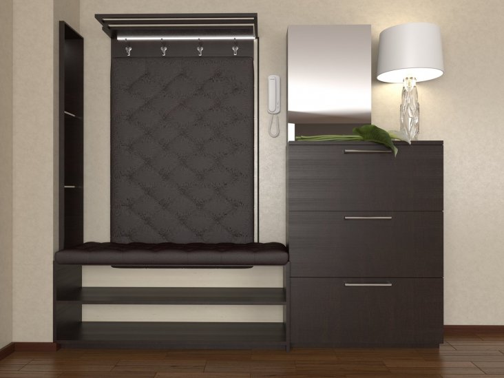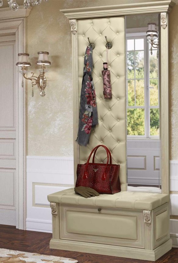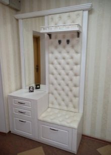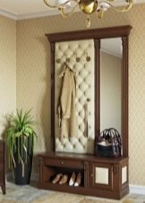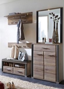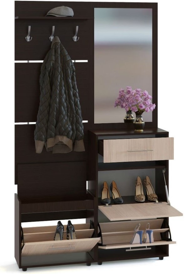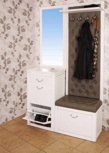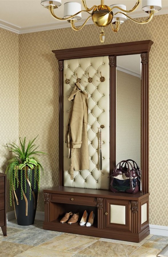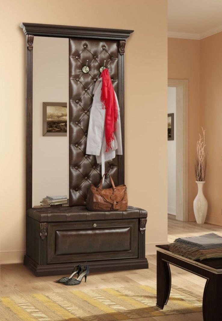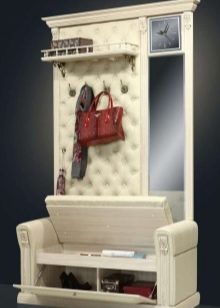 Esta opção é bastante prática, pois inclui todos os elementos de mobiliário necessários para o corredor. Na parte inferior da estrutura existe uma sapateira com gavetas rebatíveis, onde cabem cerca de dez pares. No lado direito, há uma gaveta para pequenos itens com um armário para um telefone e outros acessórios. Um grande espelho está preso acima da prateleira. O lado esquerdo do móvel contém uma bancada para calçar sapatos, ganchos para agasalhos e uma pequena prateleira para chapéus.