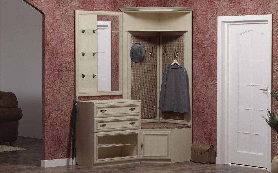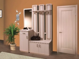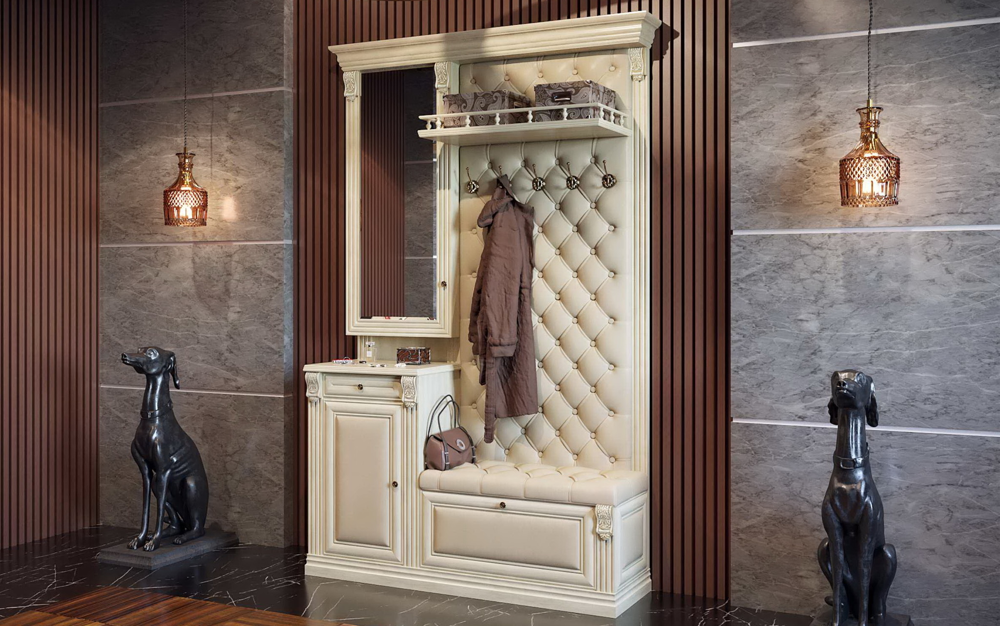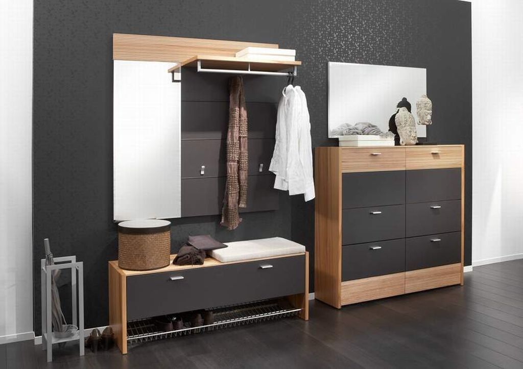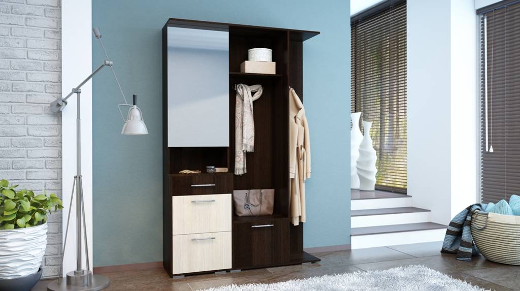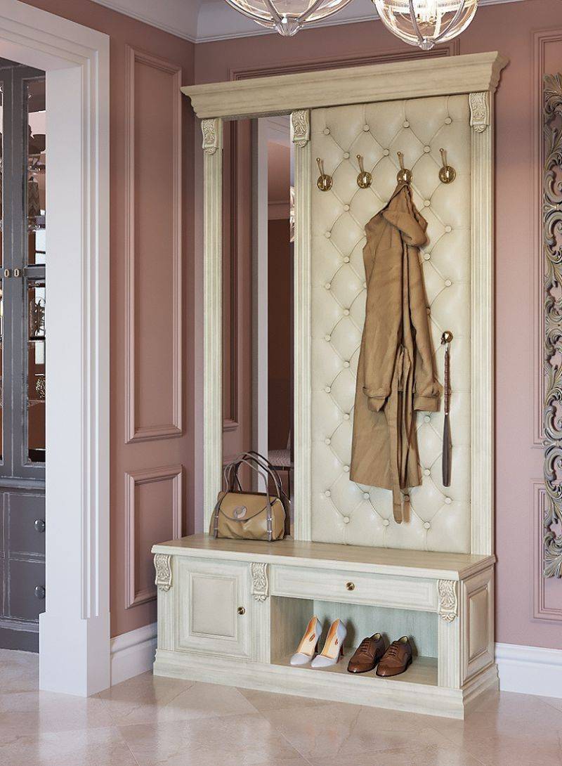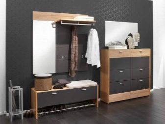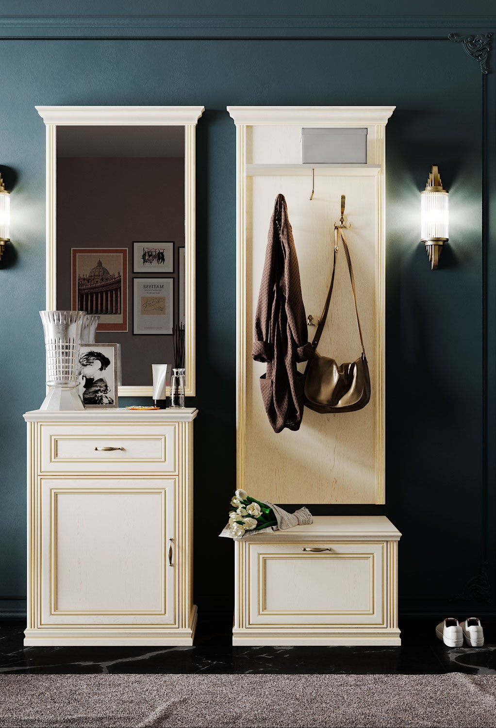 Esta opção é bastante prática, pois inclui todos os elementos de mobiliário necessários para o corredor. Na parte inferior da estrutura existe uma sapateira com gavetas rebatíveis, onde cabem cerca de dez pares. No lado direito, há uma gaveta para pequenos itens com um armário para um telefone e outros acessórios. Um grande espelho está preso acima da prateleira. O lado esquerdo do móvel contém uma bancada para calçar sapatos, ganchos para agasalhos e uma pequena prateleira para chapéus.