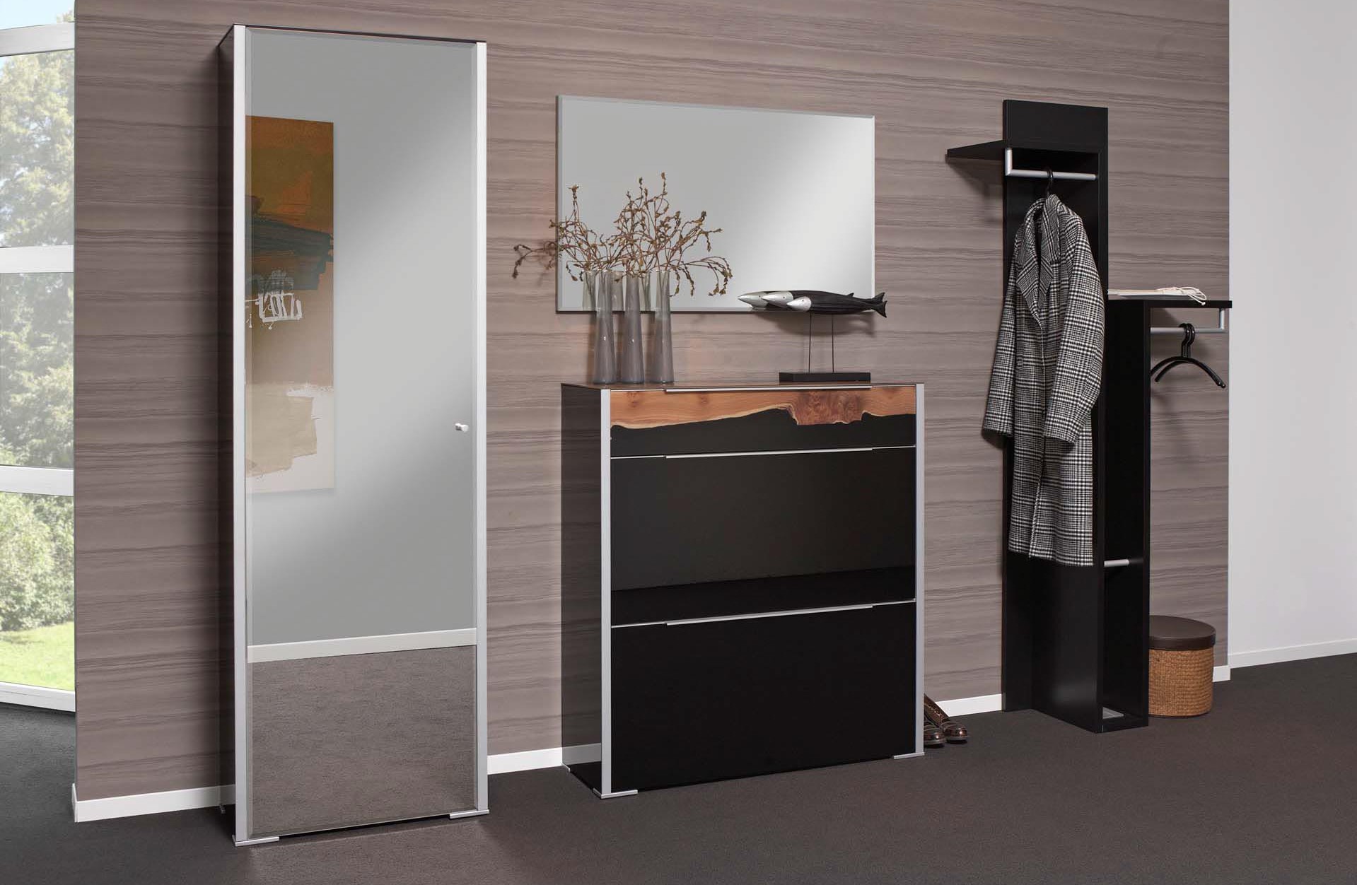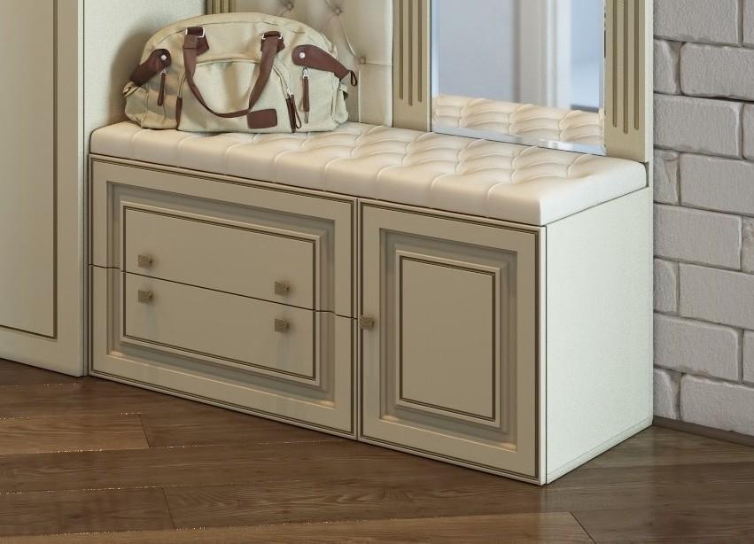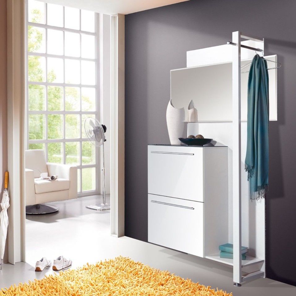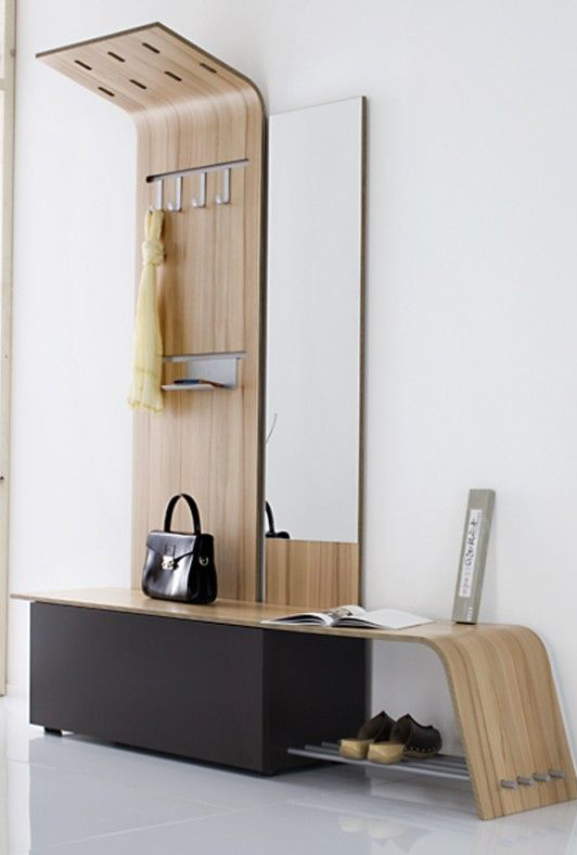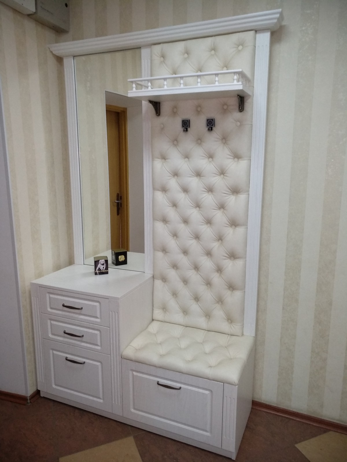 Esta opção é bastante prática, pois inclui todos os elementos de mobiliário necessários para o corredor. Na parte inferior da estrutura existe uma sapateira com gavetas rebatíveis, onde cabem cerca de dez pares. No lado direito, há uma gaveta para pequenos itens com um armário para um telefone e outros acessórios. Um grande espelho está preso acima da prateleira. O lado esquerdo do móvel contém uma bancada para calçar sapatos, ganchos para agasalhos e uma pequena prateleira para chapéus.