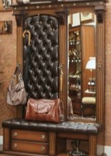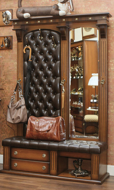 Luxuosa construção para corredor em estilo clássico, em madeira natural. A parte inferior é apresentada em forma de sapateira dobrável com prateleiras fundas e assento de couro macio. Acima há uma estrutura com espelho e uma placa com ganchos para agasalhos, forrada com couro acolchoado. Inserções laterais na forma de madeira entalhada conferem ao produto uma aparência cara e impressionante.