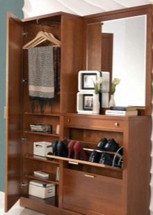 - Modelos de gaveta. Essa sapateira é um móvel em que você pode armazenar não apenas sapatos, mas também outros itens. Via de regra, esses designs representam um grande armário com prateleiras para organizar os sapatos na parte inferior e uma gaveta na parte superior. Aqui você pode guardar suas chaves, carteira e outras pequenas coisas que você precisa ao sair de casa.