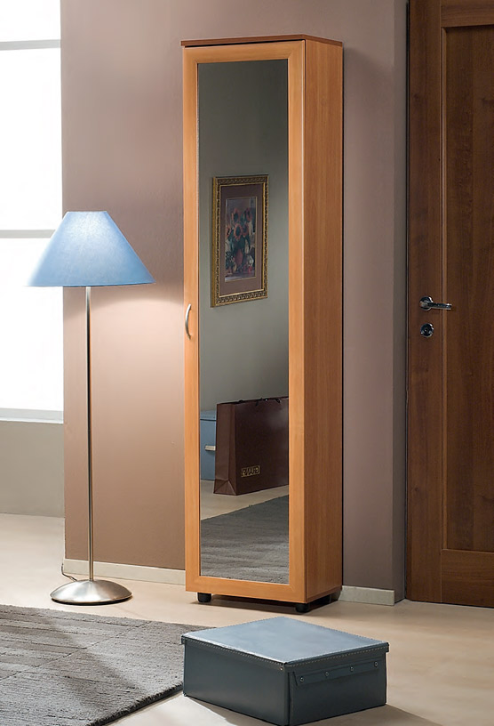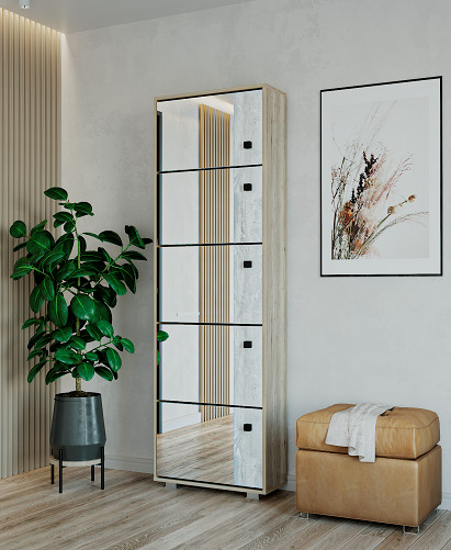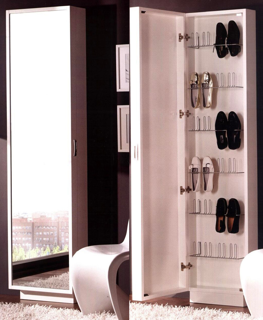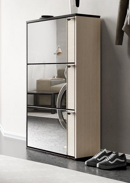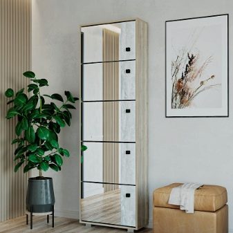 - Com um espelho no topo. O tipo mais popular de porta-sapatos. São considerados os modelos mais versáteis e práticos. A parte inferior é um pedestal alto, em cuja prateleira superior você pode colocar várias coisinhas. Um grande espelho está preso a ele.
