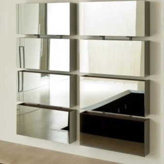 Uma ótima opção para um corredor em um estilo moderno que parece muito elegante e se encaixa perfeitamente no interior geral. Nesse caso, as caixas de sapatos se apresentam como um elemento decorativo com fachada espelhada, que amplia visualmente o espaço e se torna um verdadeiro destaque do corredor. A frente das prateleiras pode ser dobrada para trás e, no interior, encontram-se suportes especiais para a fixação de sapatos.