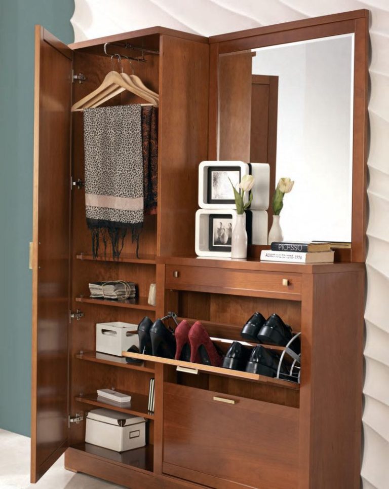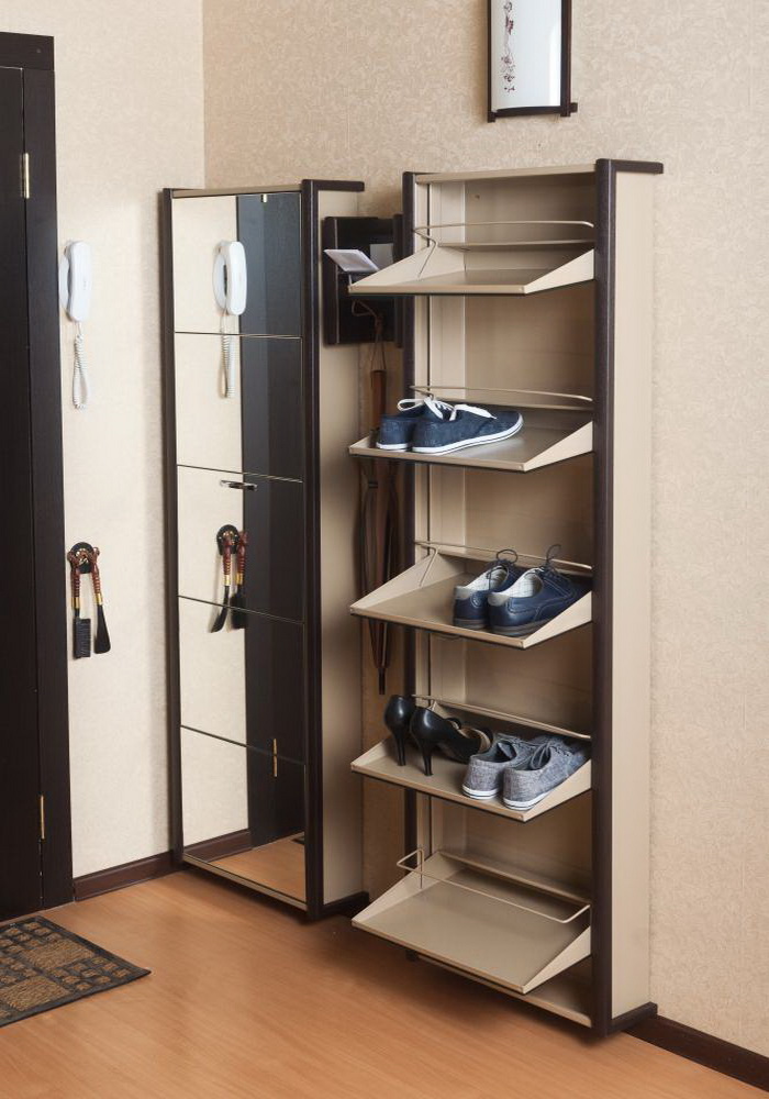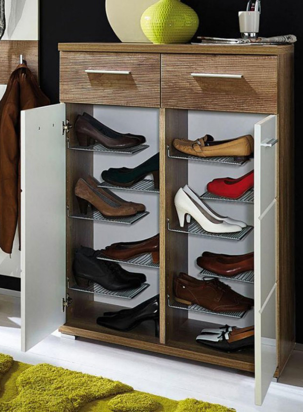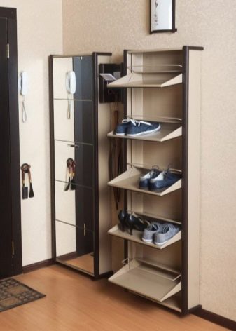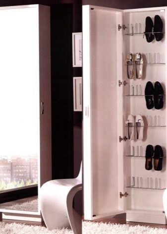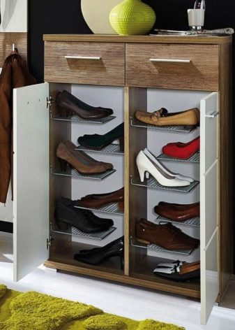 Se as dimensões do corredor permitirem, recomenda-se escolher estruturas profundas onde os calçados serão armazenados na posição horizontal. Em modelos compactos e estreitos, o armazenamento é executado verticalmente e as gavetas podem ser dobradas para trás.