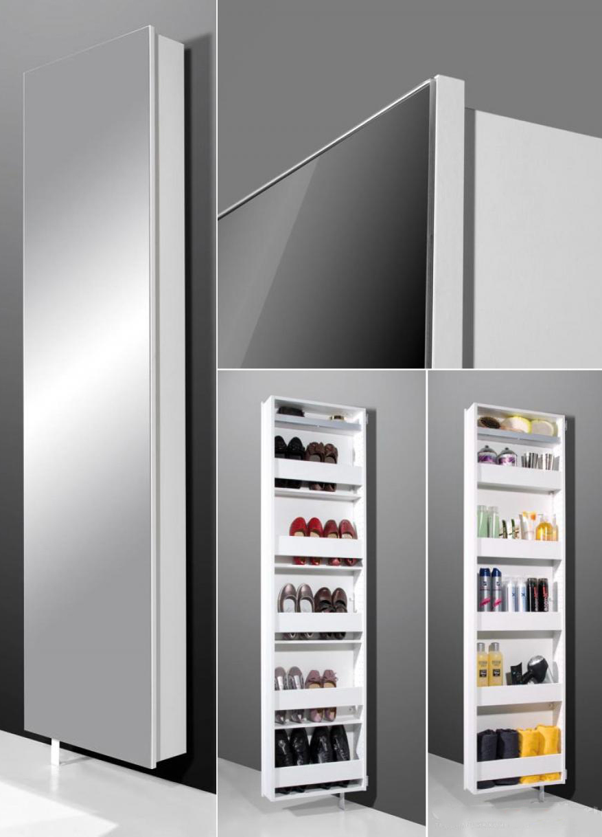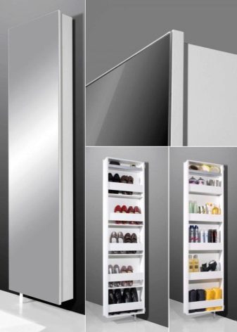 - Swivel. Este projeto é fixado em uma haste de metal ou outro mecanismo giratório que simula a aparência de um gabinete flutuante. A parte de trás do armário é para guardar sapatos, a frente é um espelho.