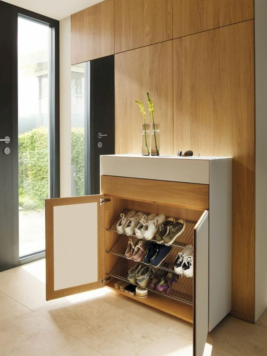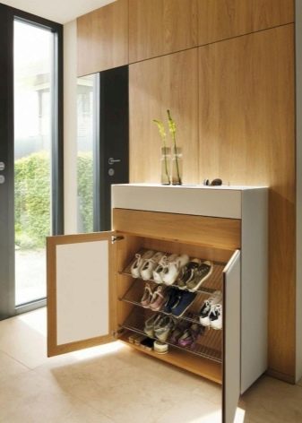 Os armários para sapatos podem ser abertos ou fechados. Nesse caso, tudo depende das preferências pessoais dos proprietários dos apartamentos. A primeira opção fornece circulação de ar ideal, a segunda parece muito mais agradável esteticamente. Você pode escolher uma opção combinada.