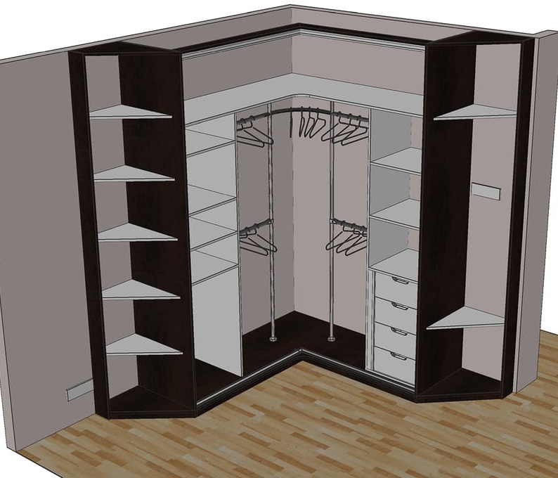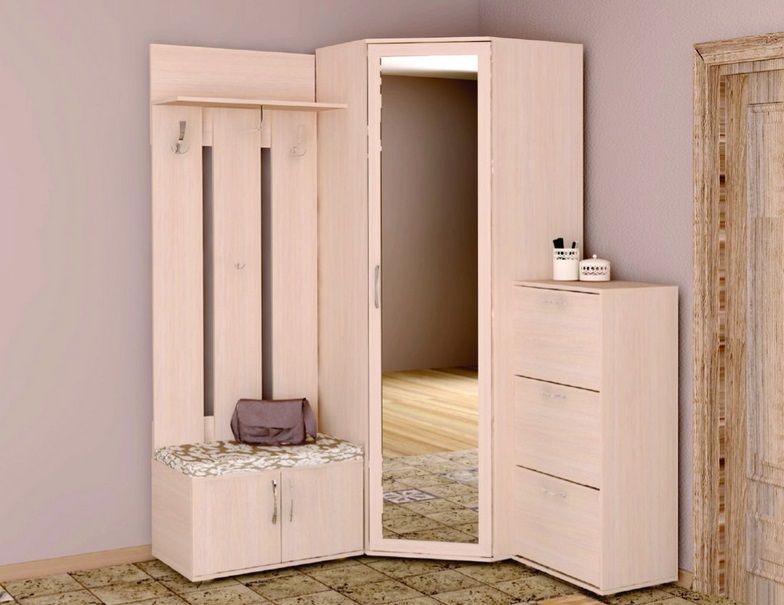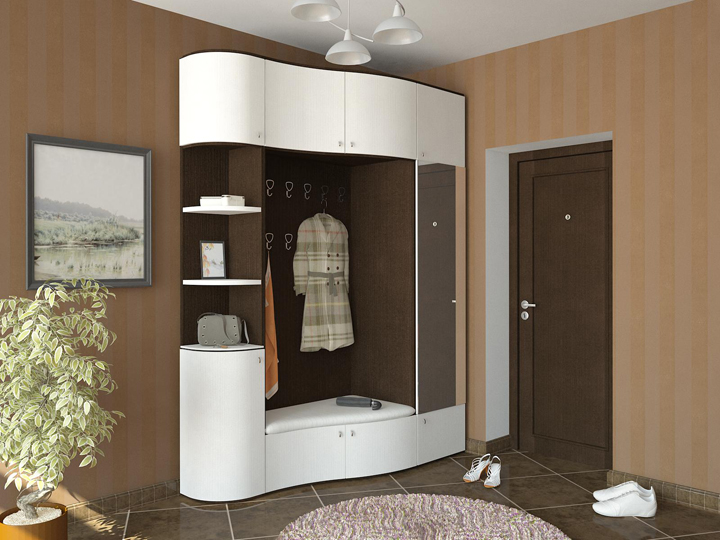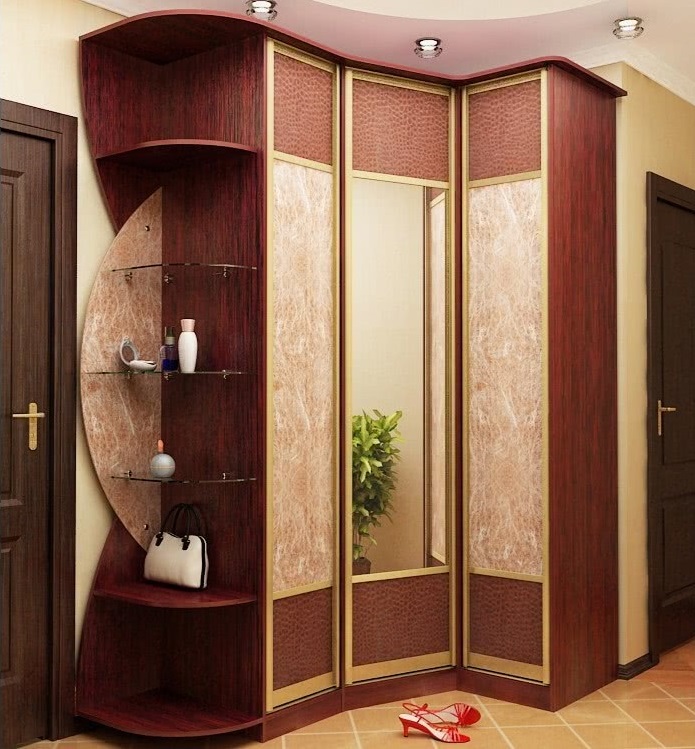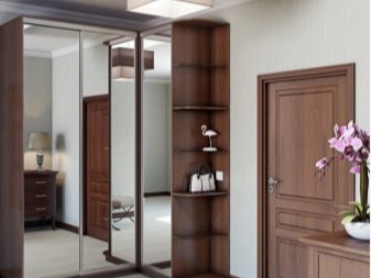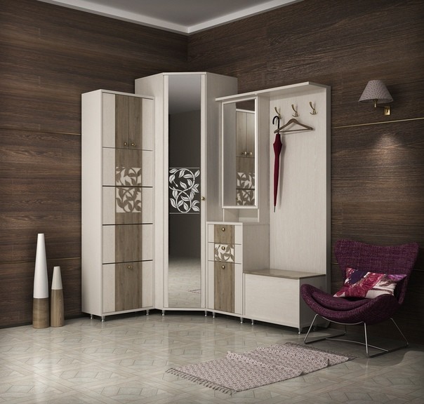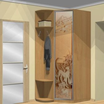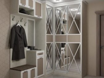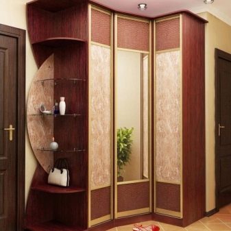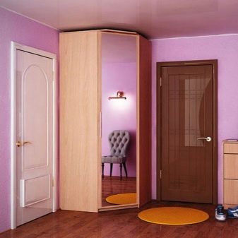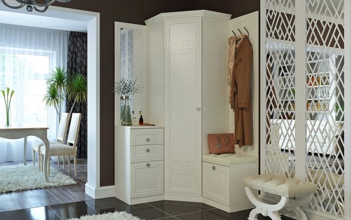 As opções de canto permitem colocar de forma compacta roupas da estação, bolsas e outros acessórios diversos. E também os sapatos são frequentemente armazenados neles. Esses modelos de gabinete podem ser feitos em uma variedade de estilos e cores, para que você possa encontrar facilmente a peça certa para qualquer interior.