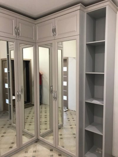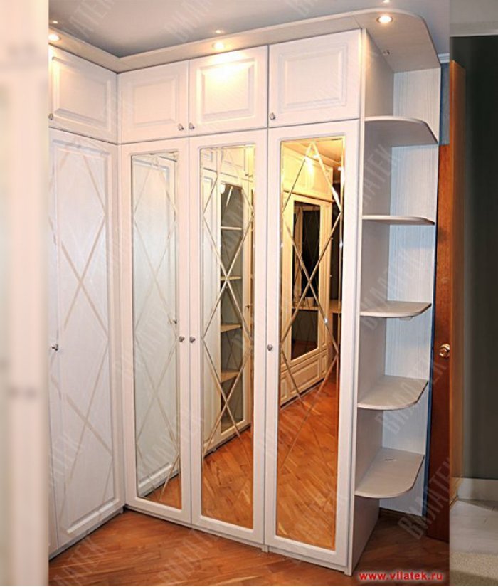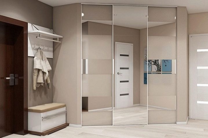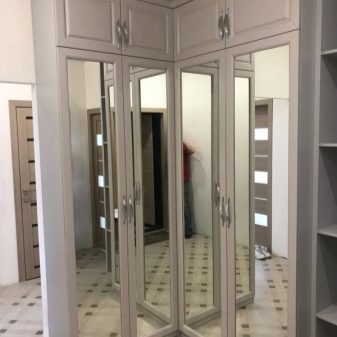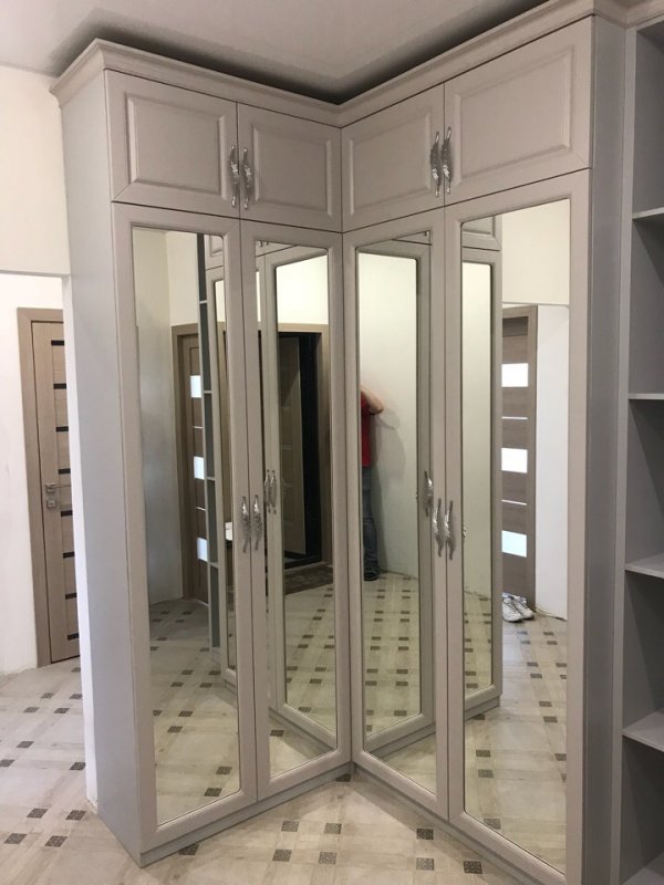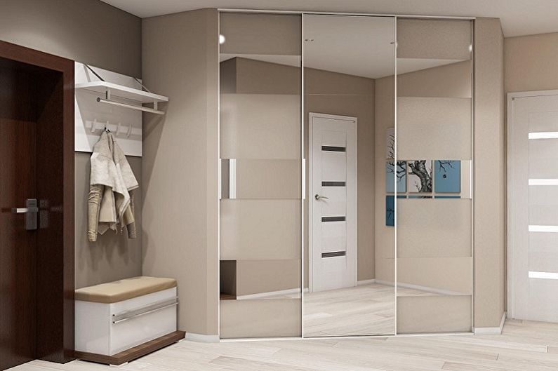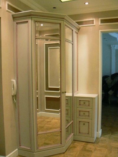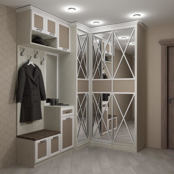 Em um grande corredor decorado em cores neutras claras, um grande armário de canto composto por várias seções ficará bem. Neste caso, a base pode ser em cinza claro ou bege, as fachadas devem ser com grandes superfícies espelhadas. Esta versão clássica não deve ser complementada com vários detalhes decorativos.