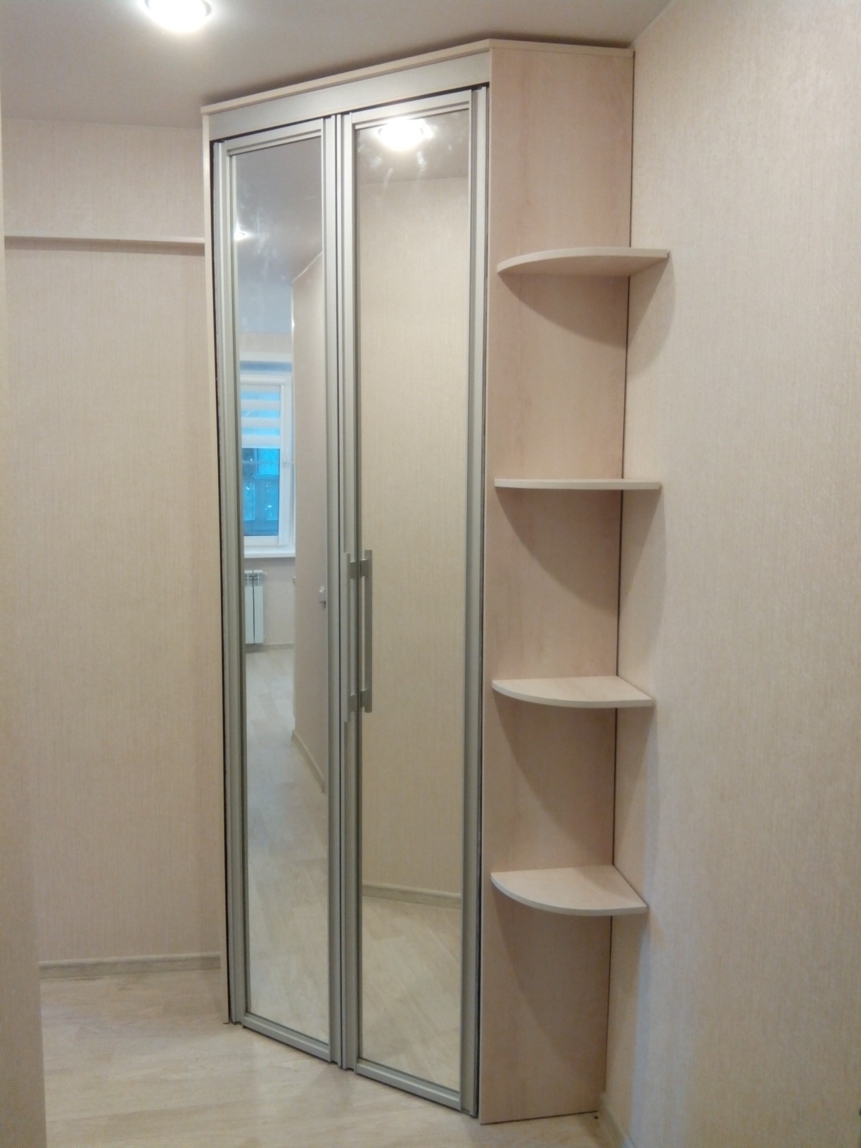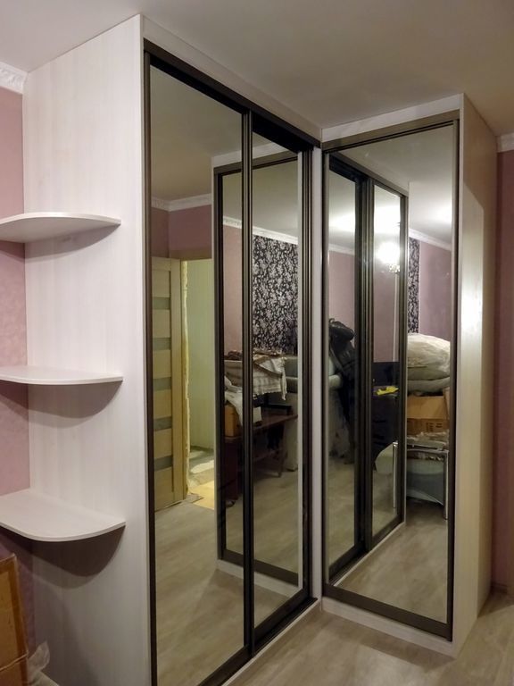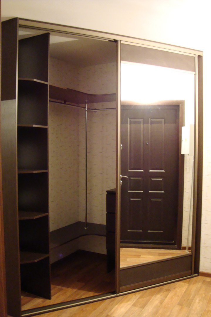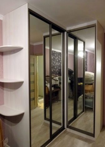 As opções de canto costumam ser usadas em corredores minimalistas. Na maioria das vezes, são guarda-roupas deslizantes com superfícies espelhadas nas portas. Modelos com fachadas monocromáticas mate também ficarão bem.