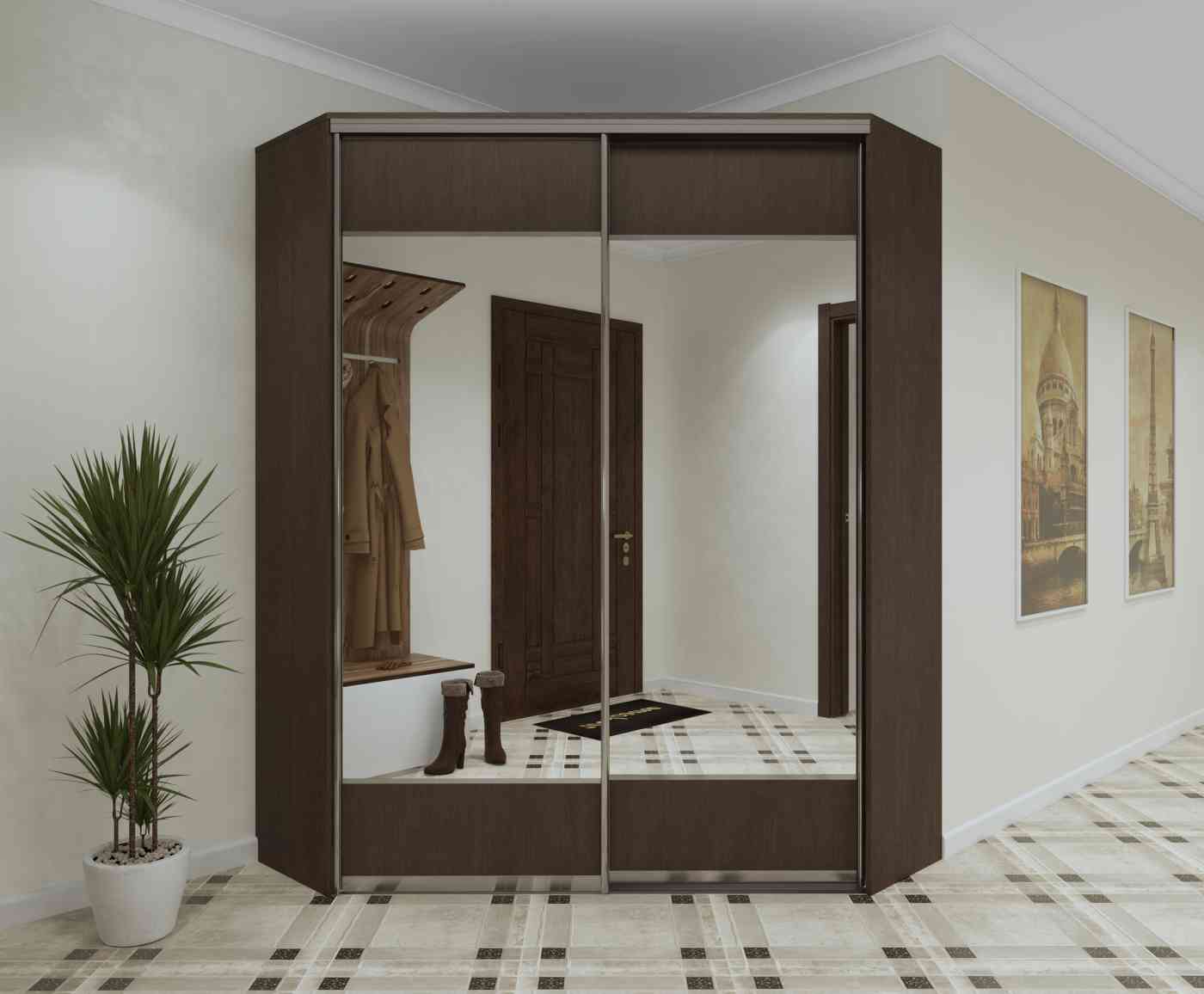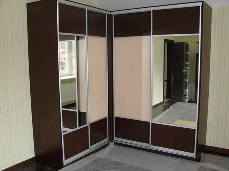 Para um corredor decorado em tons de bege, um guarda-roupa de canto enorme feito de madeira marrom escuro será adequado. Neste caso, as fachadas devem ter grandes espelhos retangulares. As portas devem ser deslizantes. Mas esta opção é melhor posicionada em corredores espaçosos.