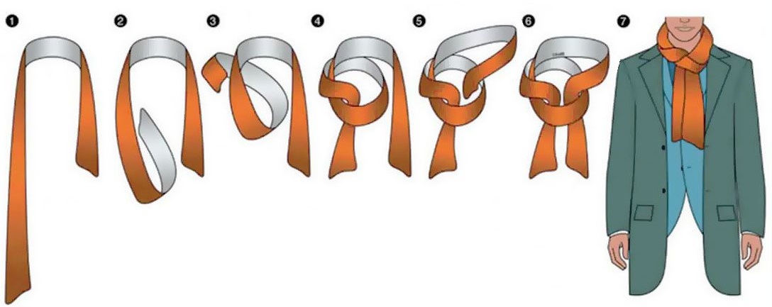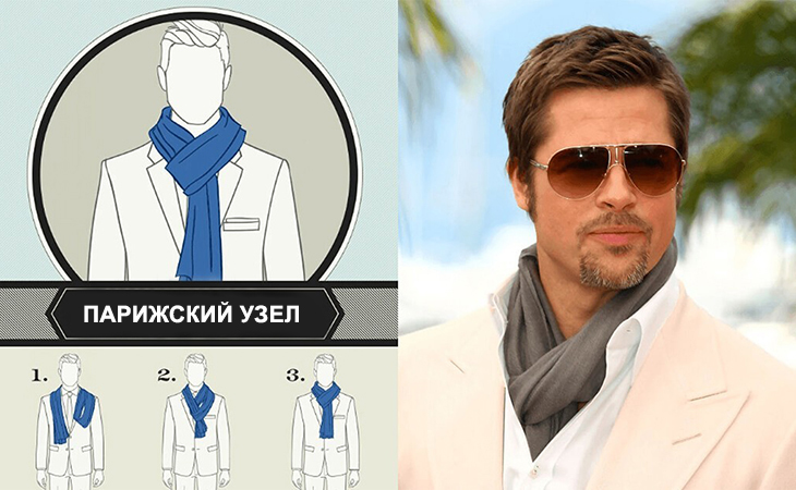 O nó universal do lenço é o parisiense, que tem um visual estiloso e se combina harmoniosamente com jaquetas, ternos, casacos e suéteres, independente de sua direção estilística. Para que o acessório fique na moda, você precisa prestar atenção especial ao seu comprimento. Os designers recomendam o uso apenas de lenços longos para os nós parisienses.