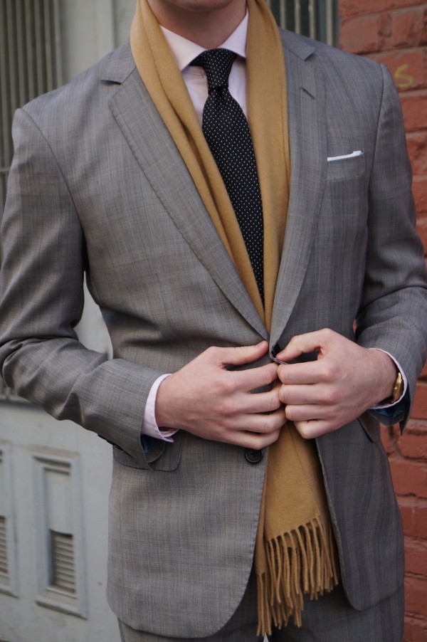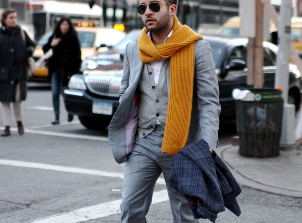 Um terno cinza clássico em combinação com um lenço de malha amarelo, com uma ponta do qual casualmente jogada sobre o ombro, enfatiza o pensamento criativo e livre de seu dono e ao mesmo tempo não interfere na imagem do negócio.