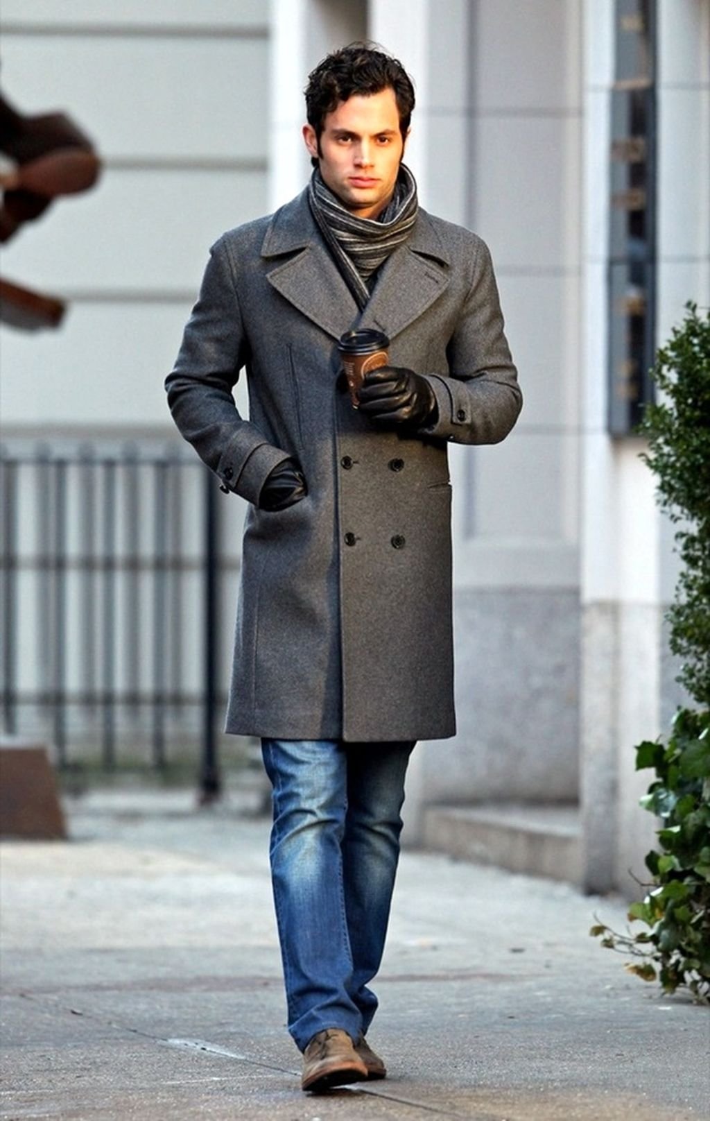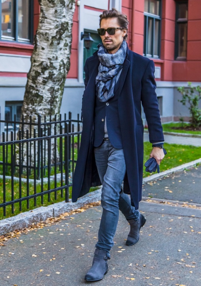 Um casaco azul alongado e um colete clássico ficam bem com um lenço amarrado em duas voltas. A harmonia geral das cores torna a imagem calma e bonita.