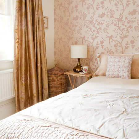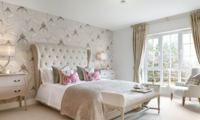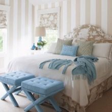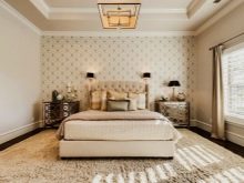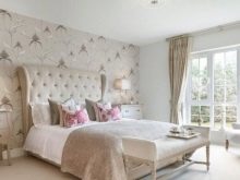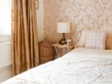 - Uma combinação perfeita de bege, branco e marrom. O papel de parede com um padrão parece harmonioso em combinação com outros itens. Tudo neste quarto foi cuidadosamente pensado, desde os têxteis à iluminação.