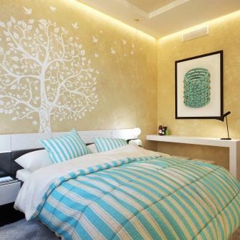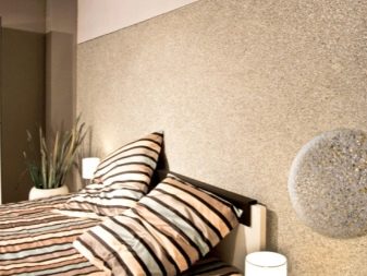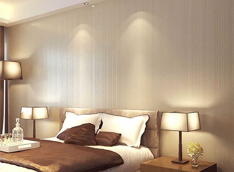 - O papel de parede líquido. Também pode ser usado no quarto. Encontrar um tom bege não é difícil. Eles são instáveis à umidade, mas este momento não é crítico para o quarto.