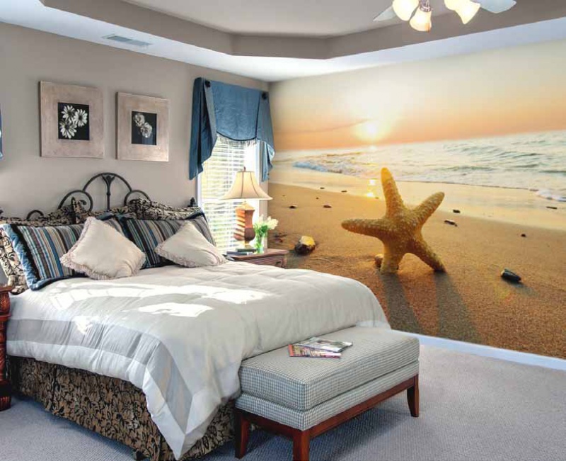 - Papel de parede de fotos. Normalmente, uma parede é decorada desta forma, enquanto outras são decoradas com as opções monocromáticas usuais.Murais de parede em tons de bege também são fáceis de encontrar.