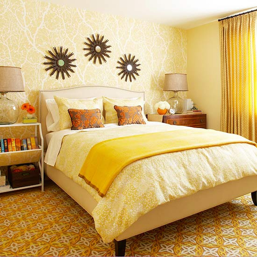 - Com o advento das cores mostarda e amarelo, o quarto só se beneficia. O bege não se perde aqui - todos os tons se complementam e juntos criam um espaço agradável para relaxar.